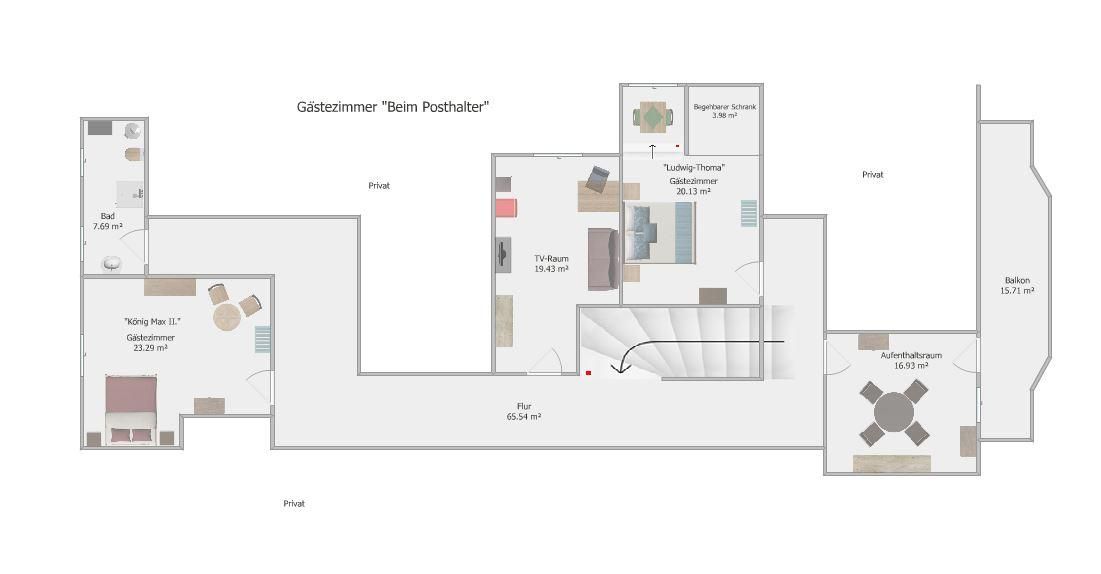 Die Wohneinheit besteht aus 2 Schlafräumen: Dem Doppelzimmer „Ludwig Thoma“ (20m²) und Doppelzimmer „König Max II.“ (25m²) im 3. Stockwerk.