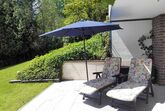 große Sonnen-Terrasse zur Südseite mit Blick in den Garten, Liegestühlen, Gartentisch/Stühle
