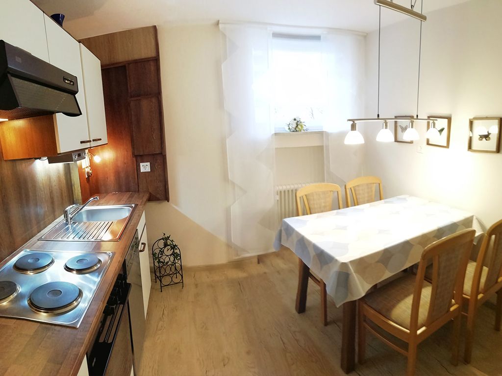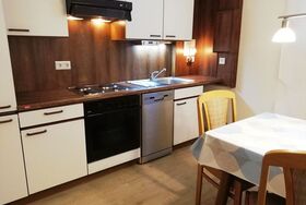 Die Einbauküche ist ausgestattet mit allen erforderlichen Küchenutensilien, Kühlschrank mit Gefrierfach, vier Herdplatten, Backofen, Geschirrspülmaschine, Mikrowelle, Kaffeemaschine, Wasserkocher, Toaster und Eierkocher, Geschirrtücher sowie gemütlicher Sitzgruppe .