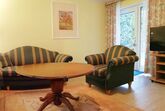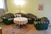 Souterrainwohnung, Wohnzimmer mit großzügigem Ecksofa Sat-TV, Terrassentüre mit Haustürfunktion (Zugang über Liegewiese).