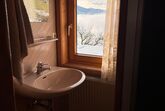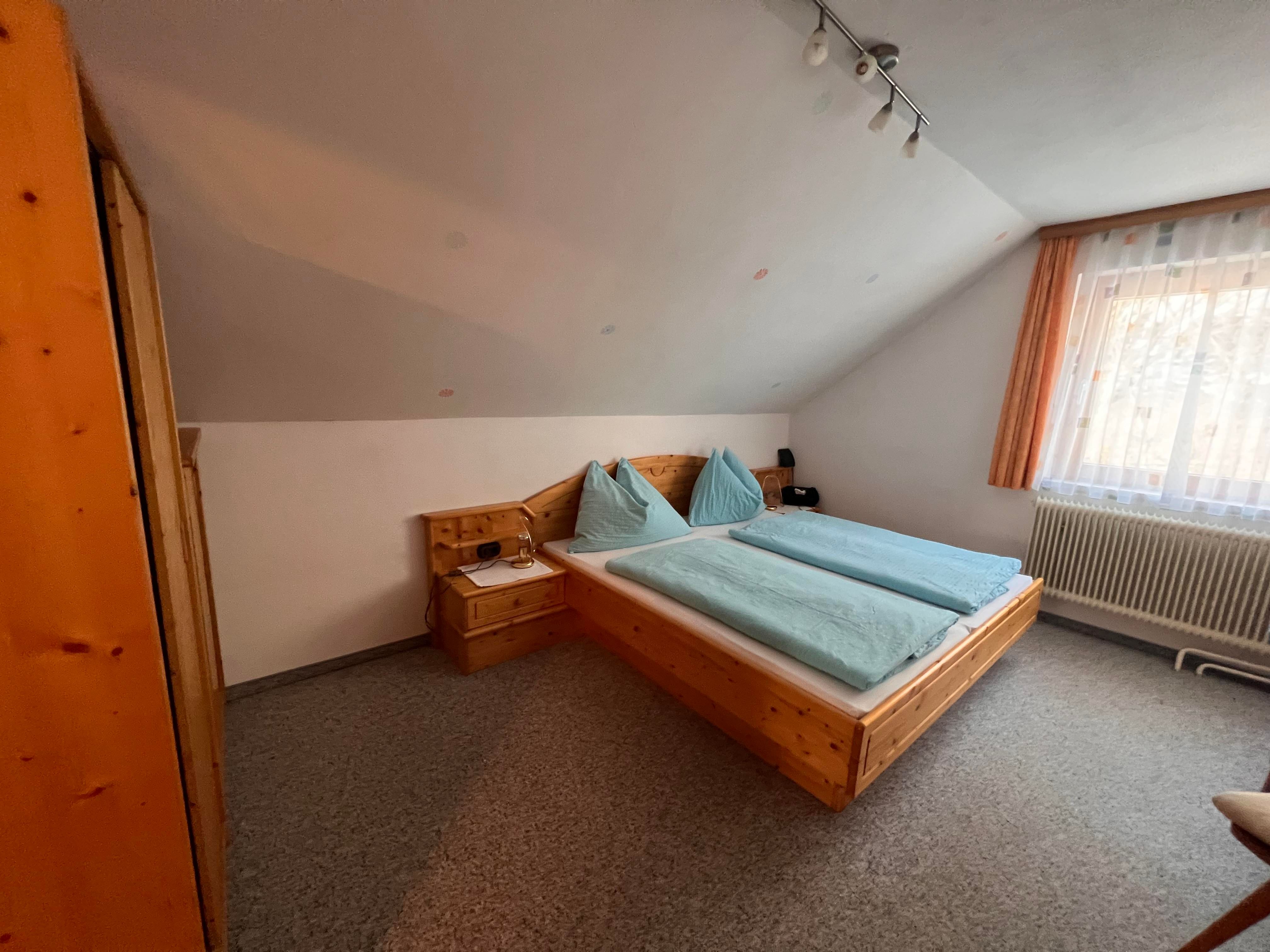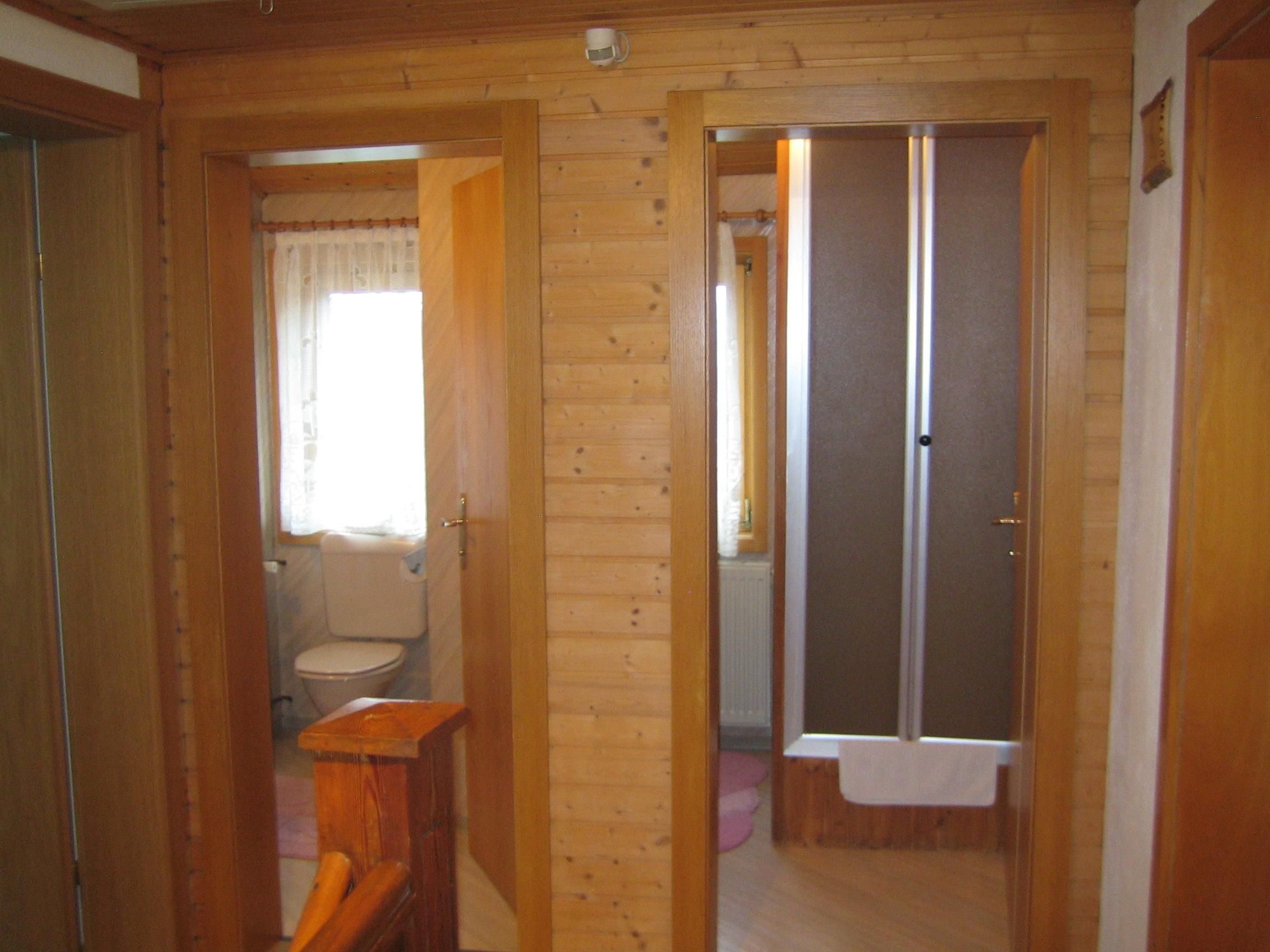 DZ in der 1. Etage mit Vogelauer-Bauernmalerei-Möbel ausgestattet - mit Panoramablick ins Ennstal und 30 m2 großer Terrasse, süd-westlich gelegen. Dieses Zimmer verfügt über ein eigenes Bad und Wc ausserhalb vom Zimmer.