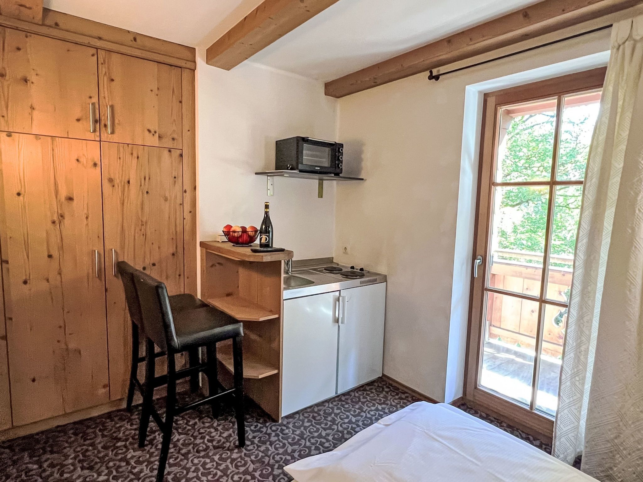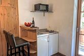 Studio, 1-Zimmer-Wohnung 20 m2. Schön und geschmackvoll eingerichtet: Wohn-/Schlafzimmer mit 1 Doppelbett (1 x 180 cm, Länge 200 cm), Esstisch und TV (Flachbildschirm). Kochnische (2 Kochplatten, Toaster, Wasserkocher, Mikrowelle, elektrische Kaffeemaschine). Dusche, sep. WC. Heizung. Balkon. Balkonmöbel. Sehr schöne Panoramasicht auf die Berge. Zur Verfügung: Internet (WLAN, gratis). Bitte beachten: Nichtraucher-Unterkunft.