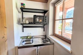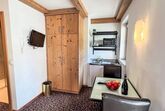 Studio, 1-Zimmer-Wohnung 20 m2. Schön und geschmackvoll eingerichtet: Wohn-/Schlafzimmer mit 1 Doppelbett (1 x 180 cm, Länge 200 cm), Esstisch und TV (Flachbildschirm). Kochnische (2 Kochplatten, Toaster, Wasserkocher, Mikrowelle, elektrische Kaffeemaschine). Dusche, sep. WC. Heizung. Balkon. Balkonmöbel. Sehr schöne Panoramasicht auf die Berge. Zur Verfügung: Internet (WLAN, gratis). Bitte beachten: Nichtraucher-Unterkunft.