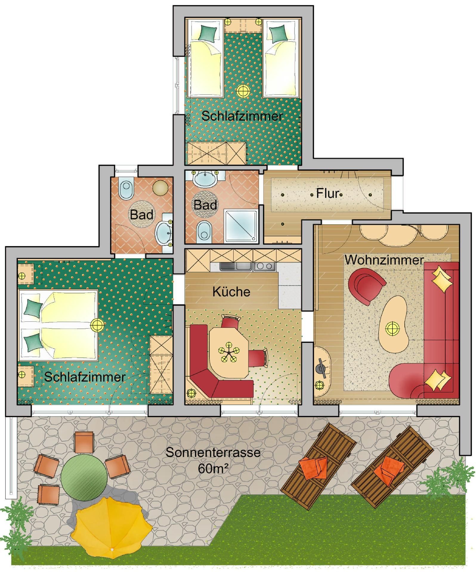 Große getrennte Liegewiese für jedes Appartement mit Gartenmöbel, Liegestühle, Sonnenschirme, Grillplatz