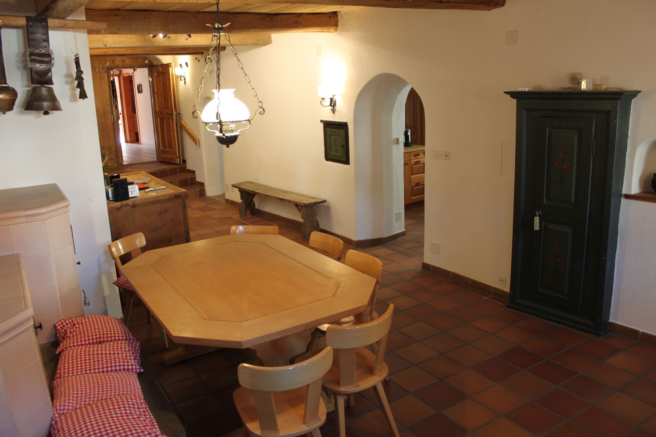 EG: Engadiner Arvenstube, Eingangshalle mit Essplatz und Bodenheizung sowie Kachelofen zusätzlicher Sitzplatz gegen Dorfbrunnen vor dem Haus, separater Eingang.