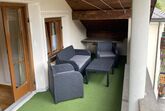 Balkon mit Sitz-Lounge und Stühlen mit Vordach, schöne Aussicht.
