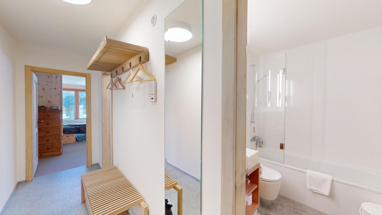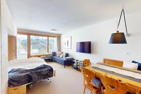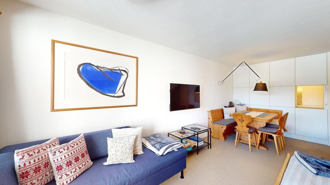 Gemütliches, hochwertig renoviertes Studio im 4. Stock mit Balkon und schöner Aussicht auf Muottas Muragl. Wohn- /Esszimmer mit Schrankbett sowie Sofaecke, die auch als Schlafsofa genutzt werden kann. Separate Küche mit Durchreiche. Bad mit Dusche/Badewanne und WC. Lift vorhanden. 1 Tiefgaragenparkplatz im Gebäude (Höhe: 2.10 m, Breite: 2.00 m).