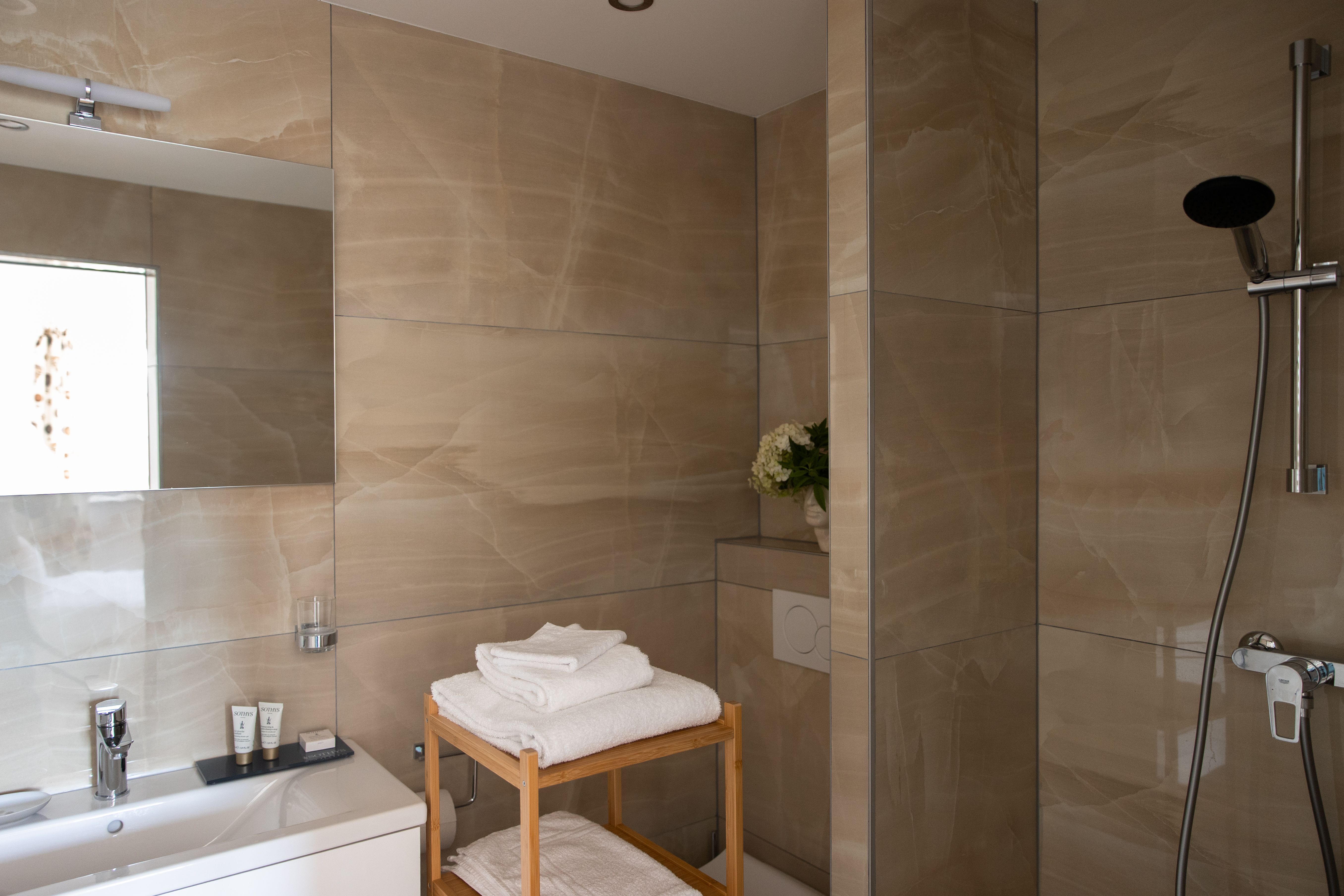 Das Interieur des Studios wurde sorgfältig ausgewählt, um Ihren Aufenthalt so angenehm wie möglich zu gestalten. Es verfügt über ein geräumiges 160cm Bett für erholsamen Schlaf, eine voll ausgestattete Kitchenette mit Kapsel-Kaffeemaschine, Wasserkocher und Minibackofen, eine praktische Esstischkombination sowie ein Badezimmer mit Dusche. All dies ohne die Notwendigkeit einer Klimaanlage oder Fußbodenheizung, da die Lage und Bauweise für ein angenehmes Raumklima sorgen.