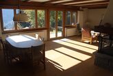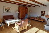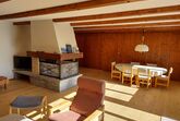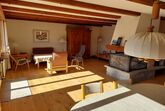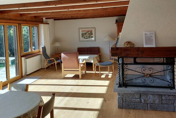 Im Parterre befindet sich das sehr grosse, stilvoll eingerichtete Wohnzimmer mit dem grossen Cheminée, einer gemütlichen Sitzecke und dem Esstisch für 8 Personen. Im Wohnzimmer befinden sich auch Radio / TV. Die zweckmässig aber vollständig (inkl. Abwaschmaschine) eingerichtete Küche ist gleich angrenzend. Ebenfalls im Parterre befindet sich ein separates WC. Der grosse Gartensitzplatz ist über das Wohnzimmer zugänglich.
