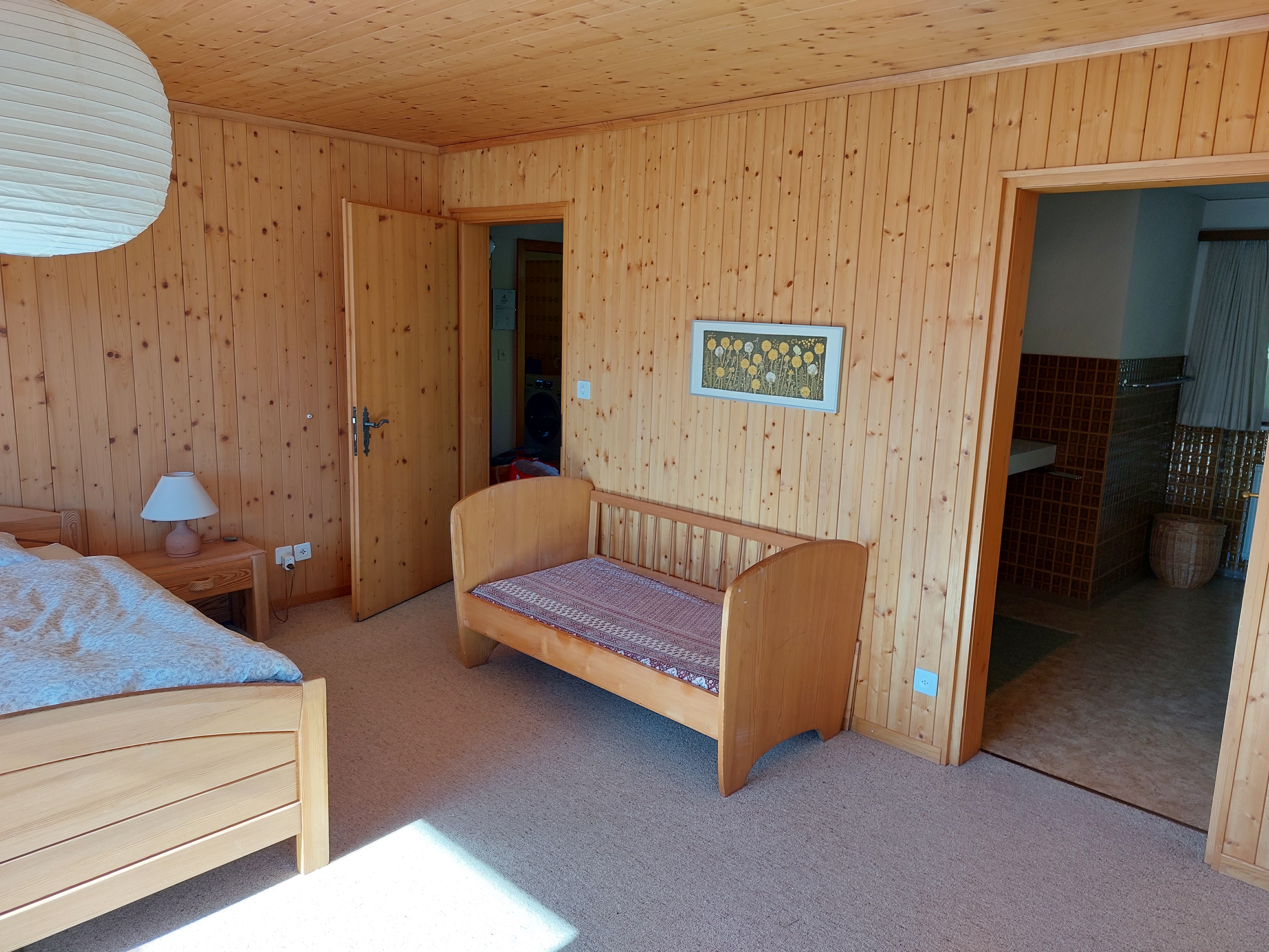 Im 1. Stock befinden sich die drei Schlafzimmer. Ein Schlafzimmer mit Doppelbett verfügt zudem über ein eigenes Badezimmer (mit Badewanne) und über einen eigenen, grossen Balkon. Über diesen gelangen Sie zudem in die Doppelgarage. In den anderen zwei Zimmern befindet sich je 2 Einzelbetten, die zusammengestellt werden können. Weiter finden Sie im 1. Stock ein weiteres Badezimmer mit Sitzbadewanne und Waschmaschine.