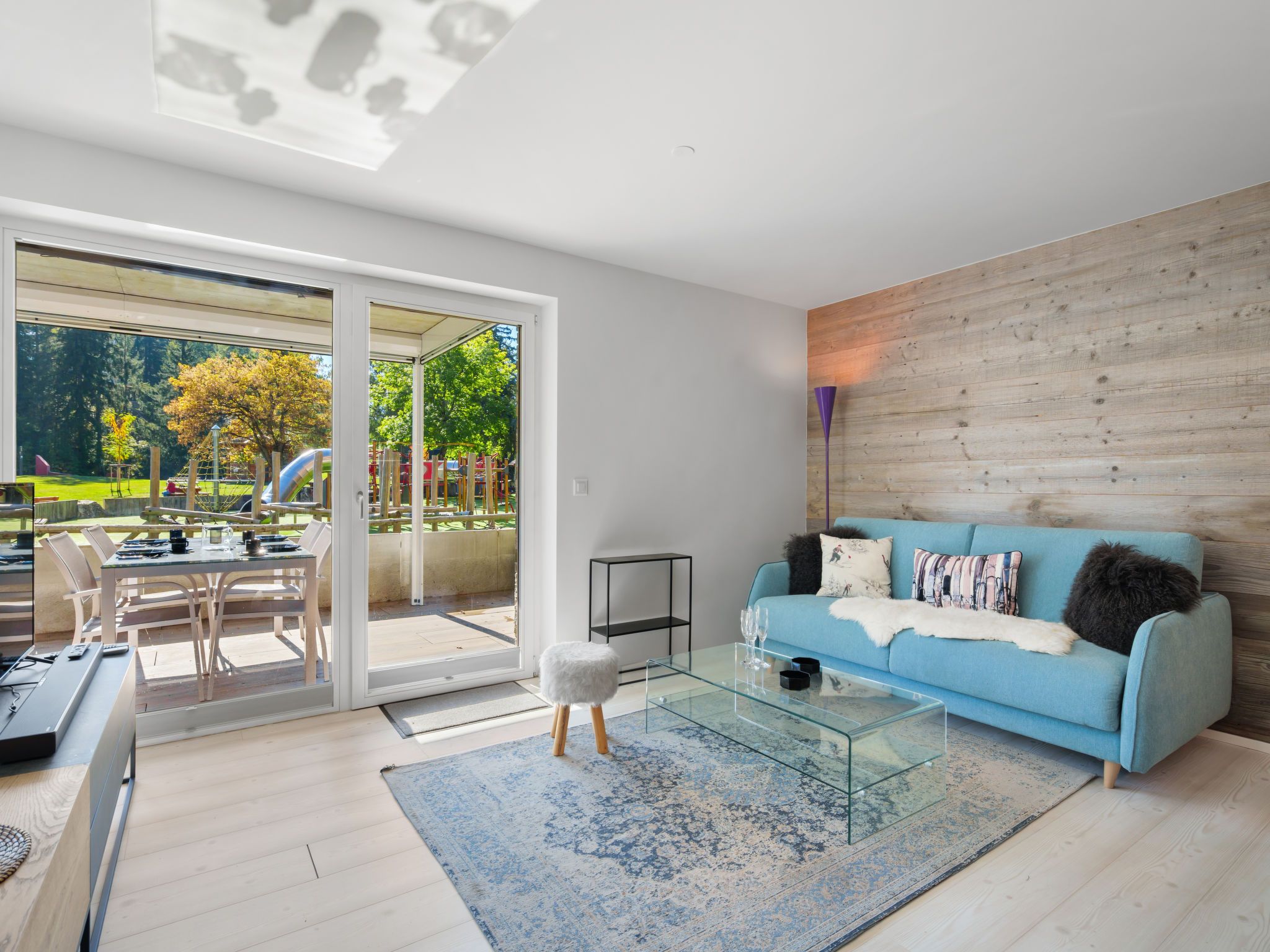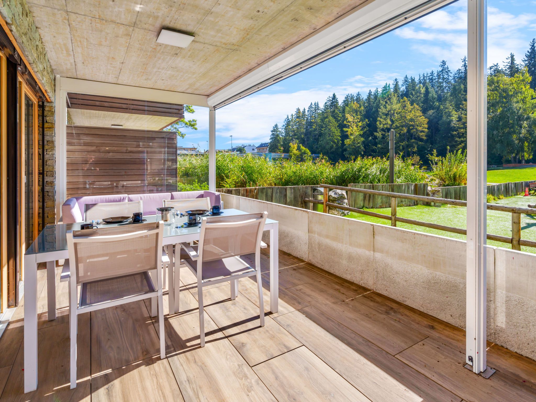 Central Parc 2, 2-Zimmer-Wohnung 69 m2, im Erdgeschoss. Vollständig renoviert im Jahre 2024, modern und geschmackvoll eingerichtet: Wohn-/Esszimmer mit 1 Doppeldiwanbett (160 cm, Länge 190 cm), Kabel-TV. Ausgang zur Terrasse. 1 grosses Zimmer mit 1 Doppelbett (2 x 90 cm, Länge 200 cm), Kabel-TV. Ausgang zur Terrasse. Offene Küche (Backofen, Geschirrspüler, Toaster, Wasserkocher, Mikrowelle, Tiefkühler, elektrische Kaffeemaschine, Kapseln für die Kaffeemaschine (Nespresso) extra, Racletteofen, Fondue Set (Käse)). Dusche/WC. Grosse Terrasse, Südlage. Terrassenmöbel. Sicht auf die Landschaft. Zur Verfügung: Waschmaschine, Wäschetrockner, Bügeleisen, Haartrockner. Internet (WLAN, gratis). Garage Nr. 44 (1 Auto), Höhe 200 cm, Breite 290 cm. Bitte beachten: geeignet für Familien. Nichtraucher-Unterkunft.
