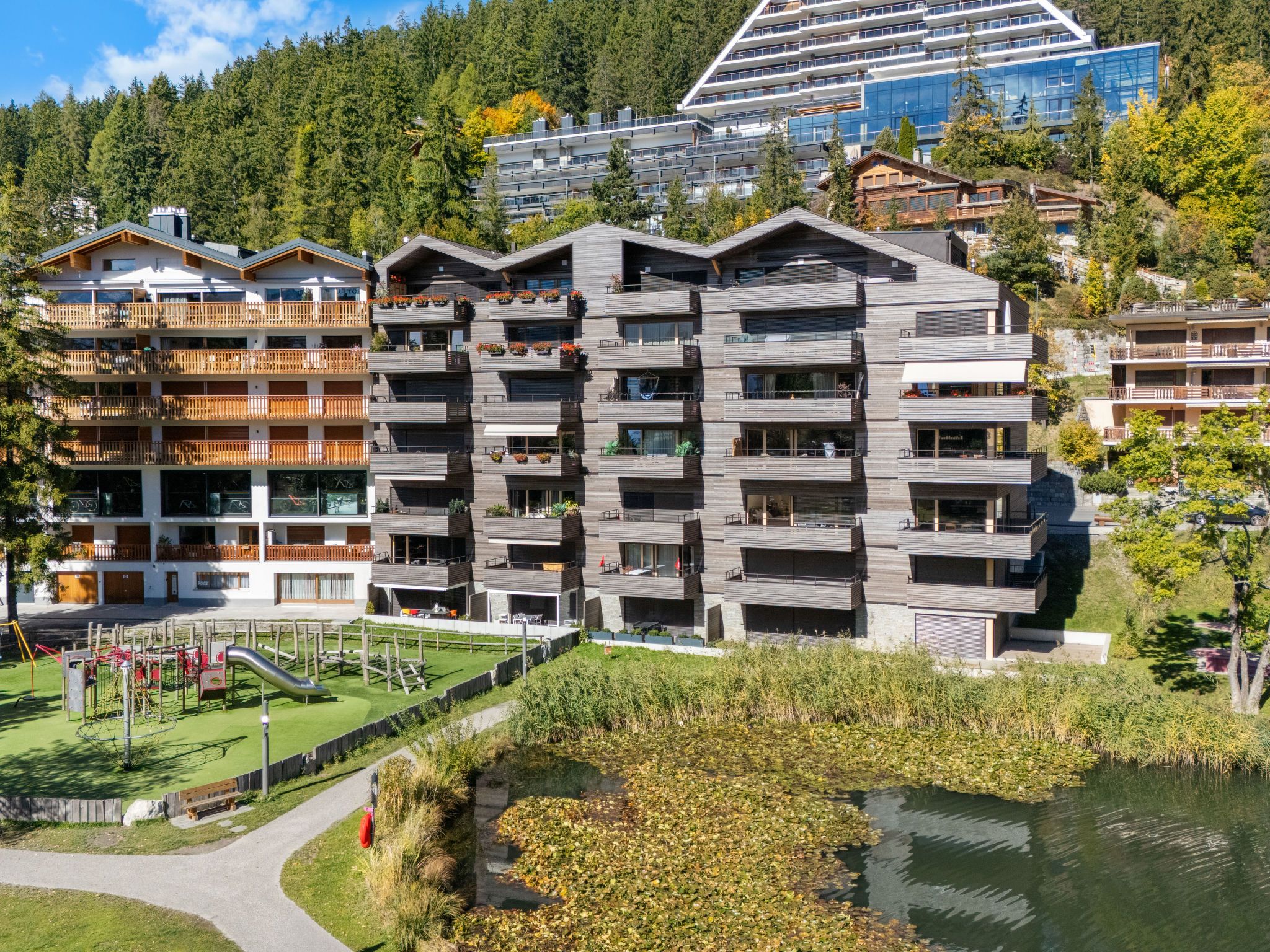 Residenz Central Parc, renoviert im Jahre 2024, umgeben von Bäumen. Im Ortszentrum von Montana, zentrale, belebte, sonnige Lage, im Herzen der Stadt, 100 m vom See, 300 m vom Skigebiet. Im Hause: Fahrstuhl, Skiraum, Zentralheizung. Gemeinschaftsgarage. Supermarkt 250 m, Restaurant 20 m, Bäckerei 450 m, Fahrradverleih 50 m, Bushaltestelle Ycoor 150 m, Bahnstation Funiculaire Montana Gare 950 m, Badesee Moubra 1.4 km, See Grenon 100 m. Golfplatz (18 Loch) 1.4 km, Tennis 1.4 km, Skisportanlagen 300 m, Eisfeld 30 m, Kinderspielplatz 10 m. Nahe gelegene Sehenswürdigkeiten: Casino 50 m, Alaïa Bay 26.7 km, Alaïa Club 5.3 km. Bekannte Seen in der Umgebung sind gut erreichbar: Etang Long 1.4 km. Wandergebiete: Bisse du Ro 3.1 km. Bitte beachten: Gratis Skibus.