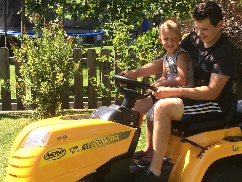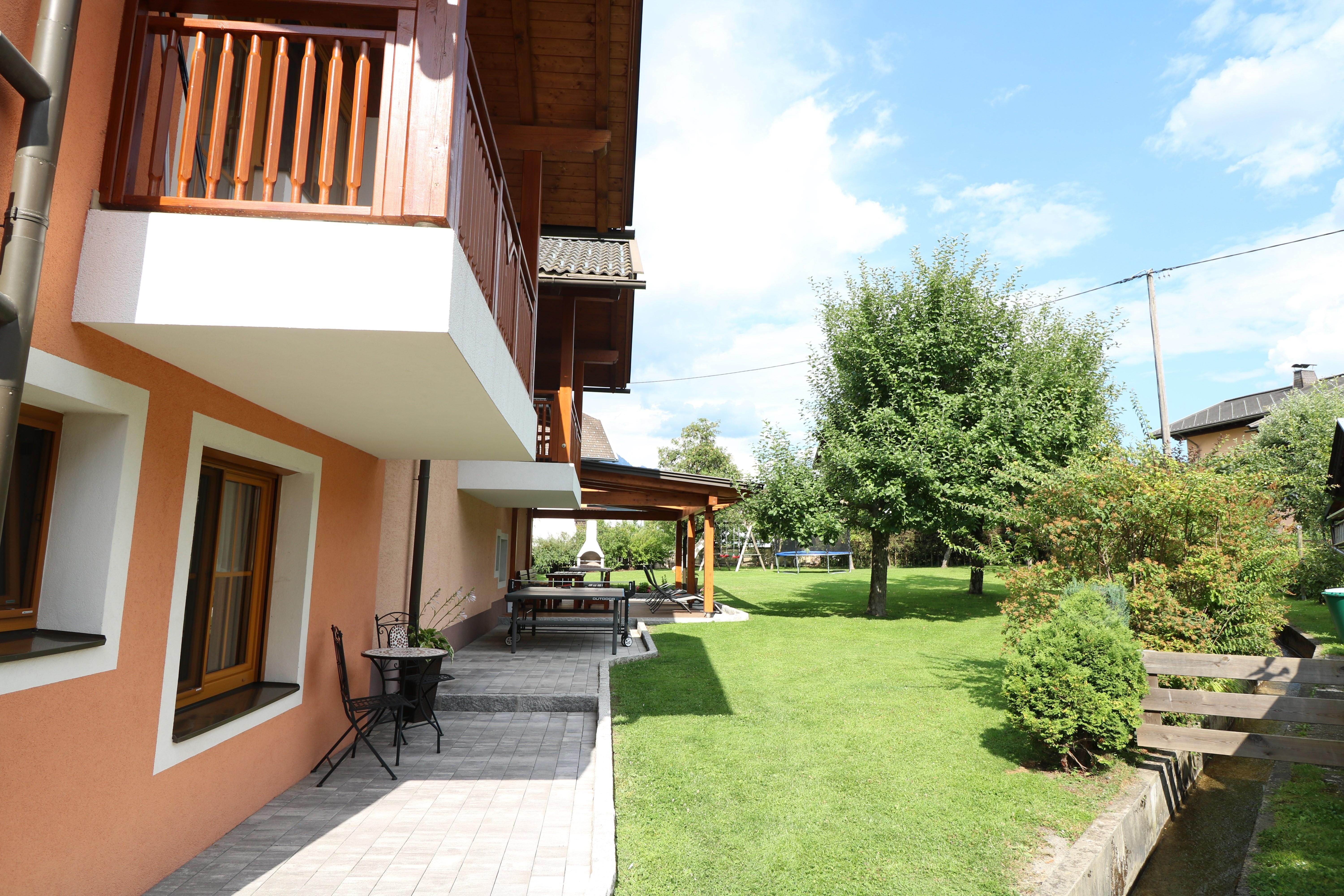 Südseitig gelegener Gästegarten mit überdachter Terrasse, gemütlichen Sitzmöglichkeiten, Liegestühlen, Griller, Tischtennis, Sonnenschirm, sowie Kinderspielplatz mit Schaukel, Trampolin und Sandkiste. Der Radweg führt direkt am Haus vorbei.
