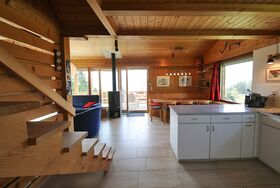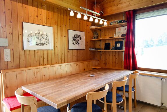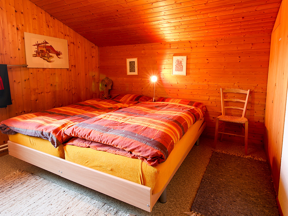Parterre: kleiner Vorraum mit Schrank, Heizungsraum mit Waschmaschine und Tumbler, Eingangsbereich mit Garderobe, Dusche/WC und Vorratsräumchen. Grosszügige, helle Wohnstube mit toller Weitsicht, Steinboden, gemütlichem Tisch für 6 - 7 Personen, TV/Radio, Sofaecke, Schwedenofen und Ausgang zur südlich gelegenen grossen Terrasse. Offene, gut eingerichtete Wohnküche mit Theke und mit üblicher Ausrüstung, inkl. Geschirrspüler. Obergeschoss: 3 Doppelschlafzimmer mit Einzelbetten (eines davon ein Kajütenbett), 1 Einzelschlafzimmer sowie ein kleines WC.
