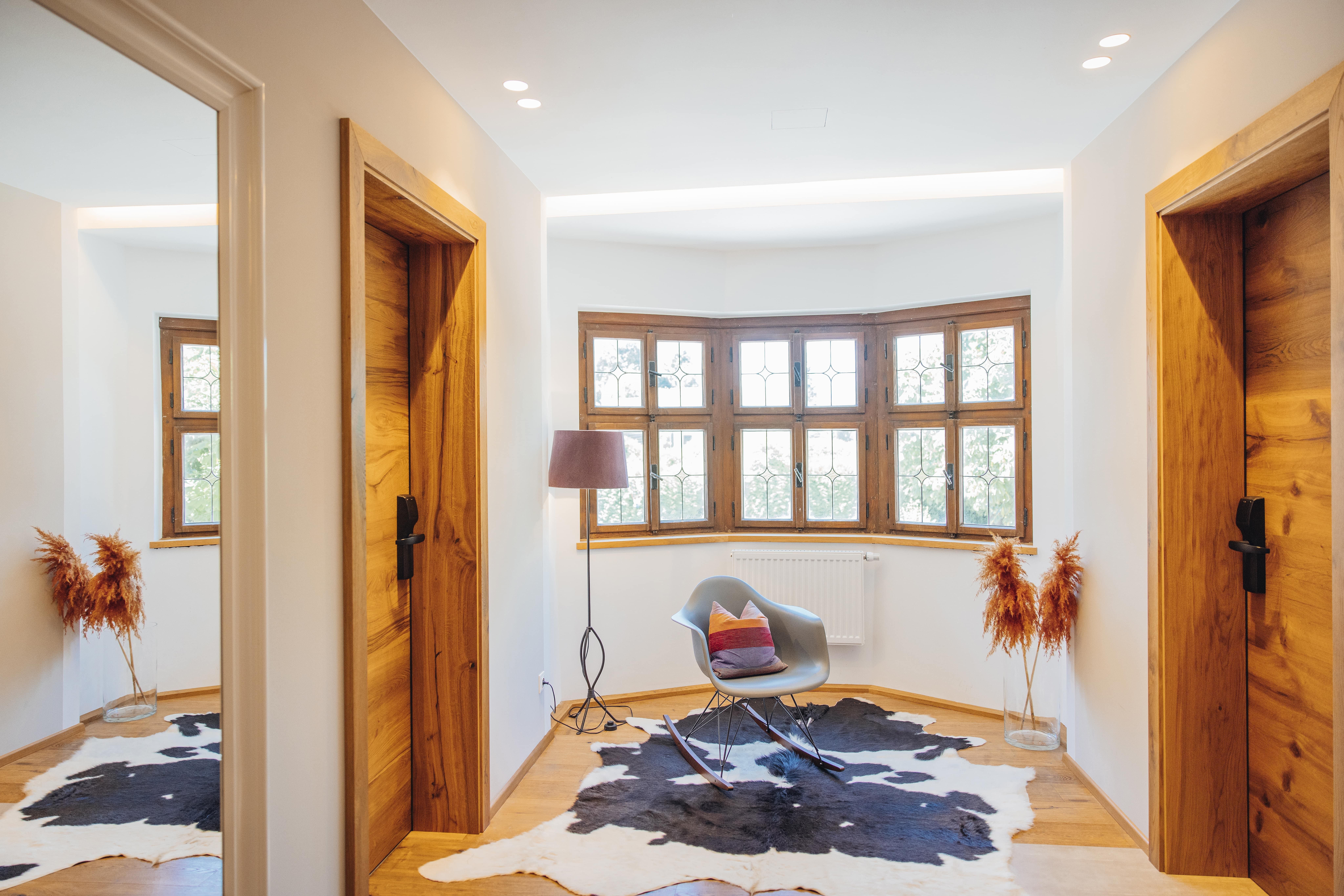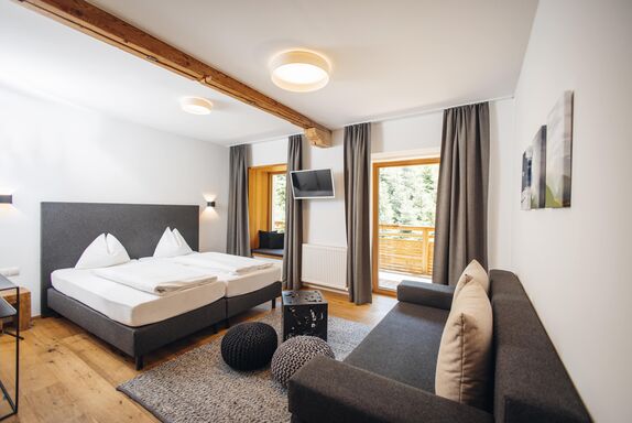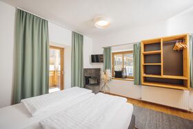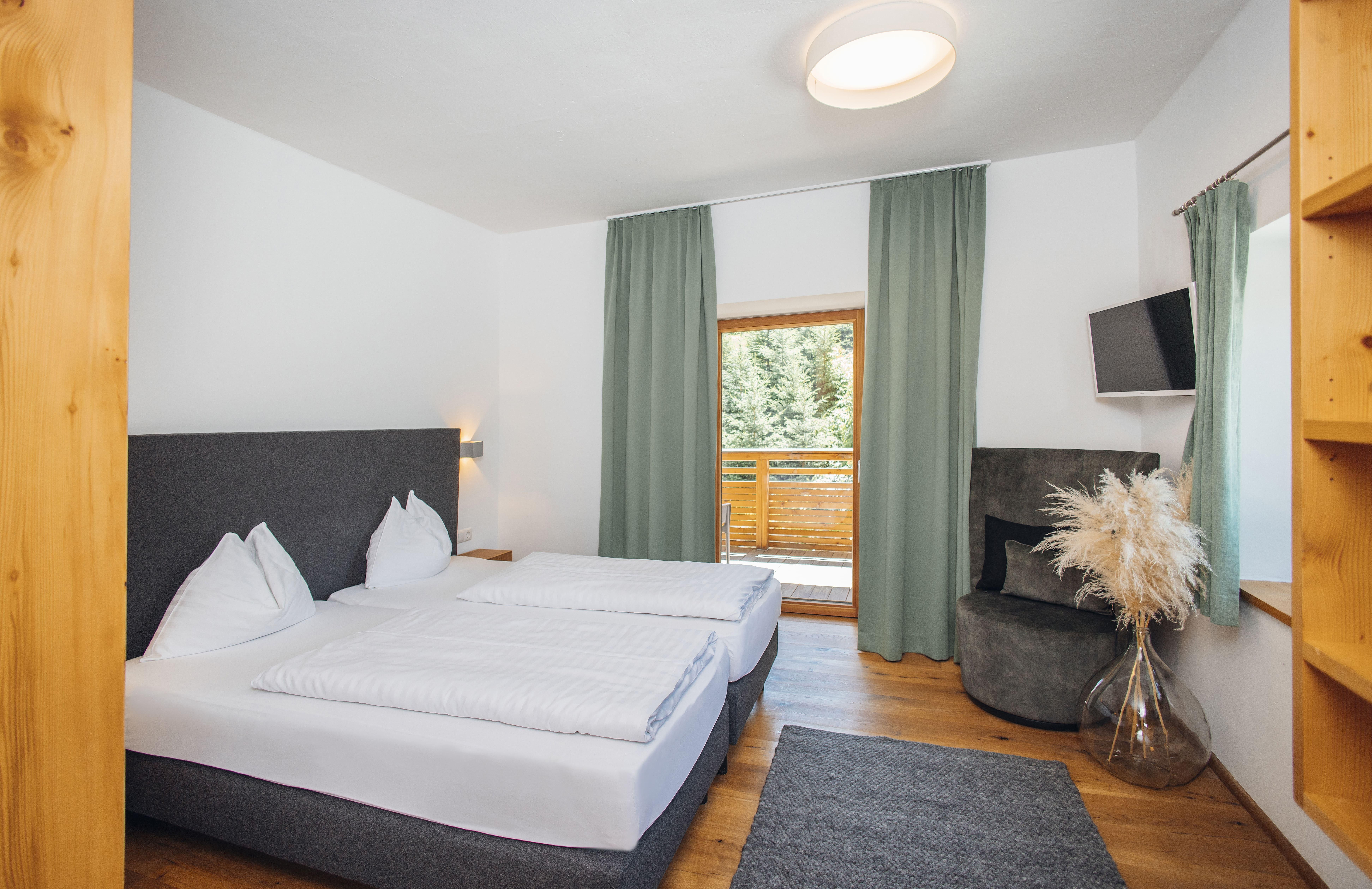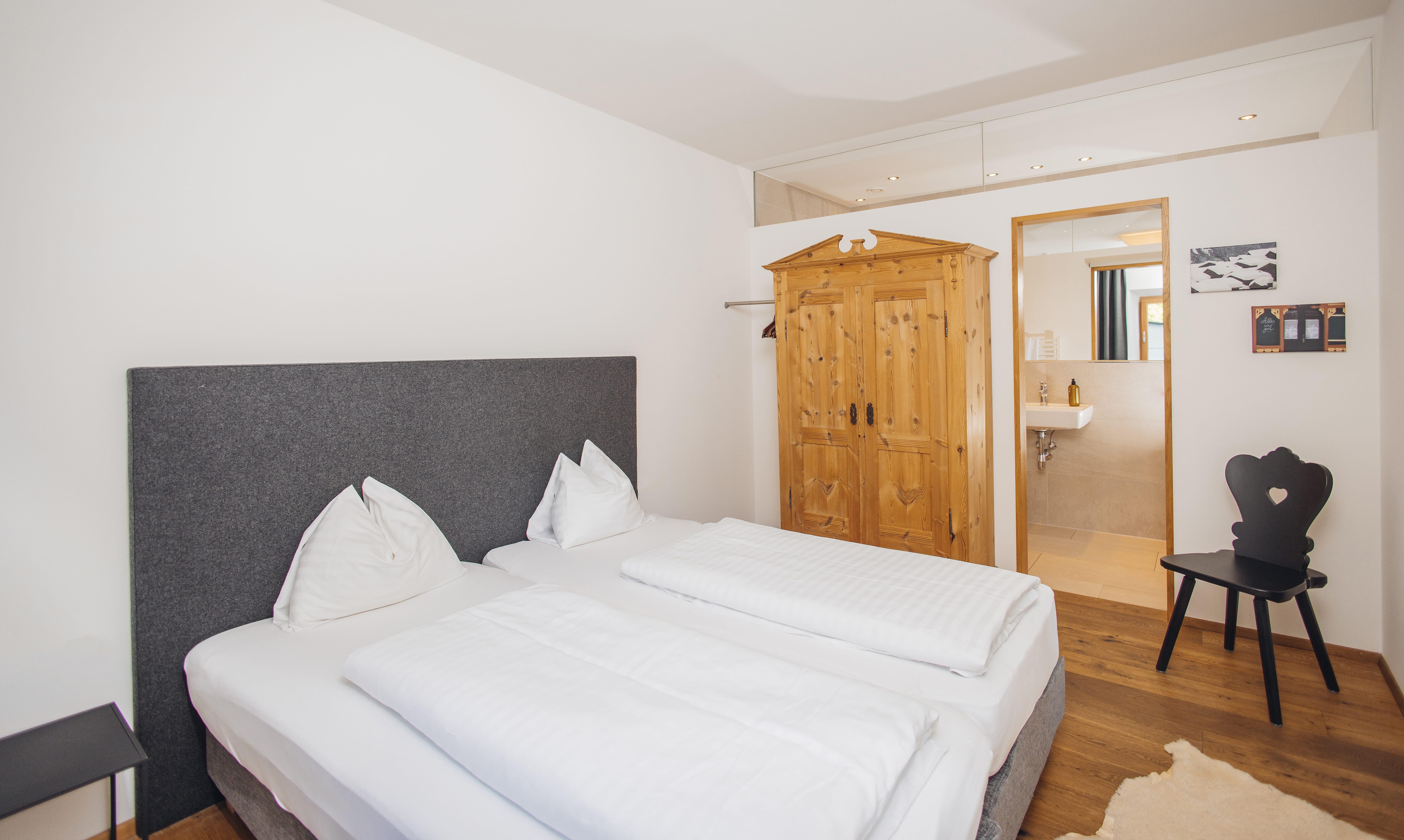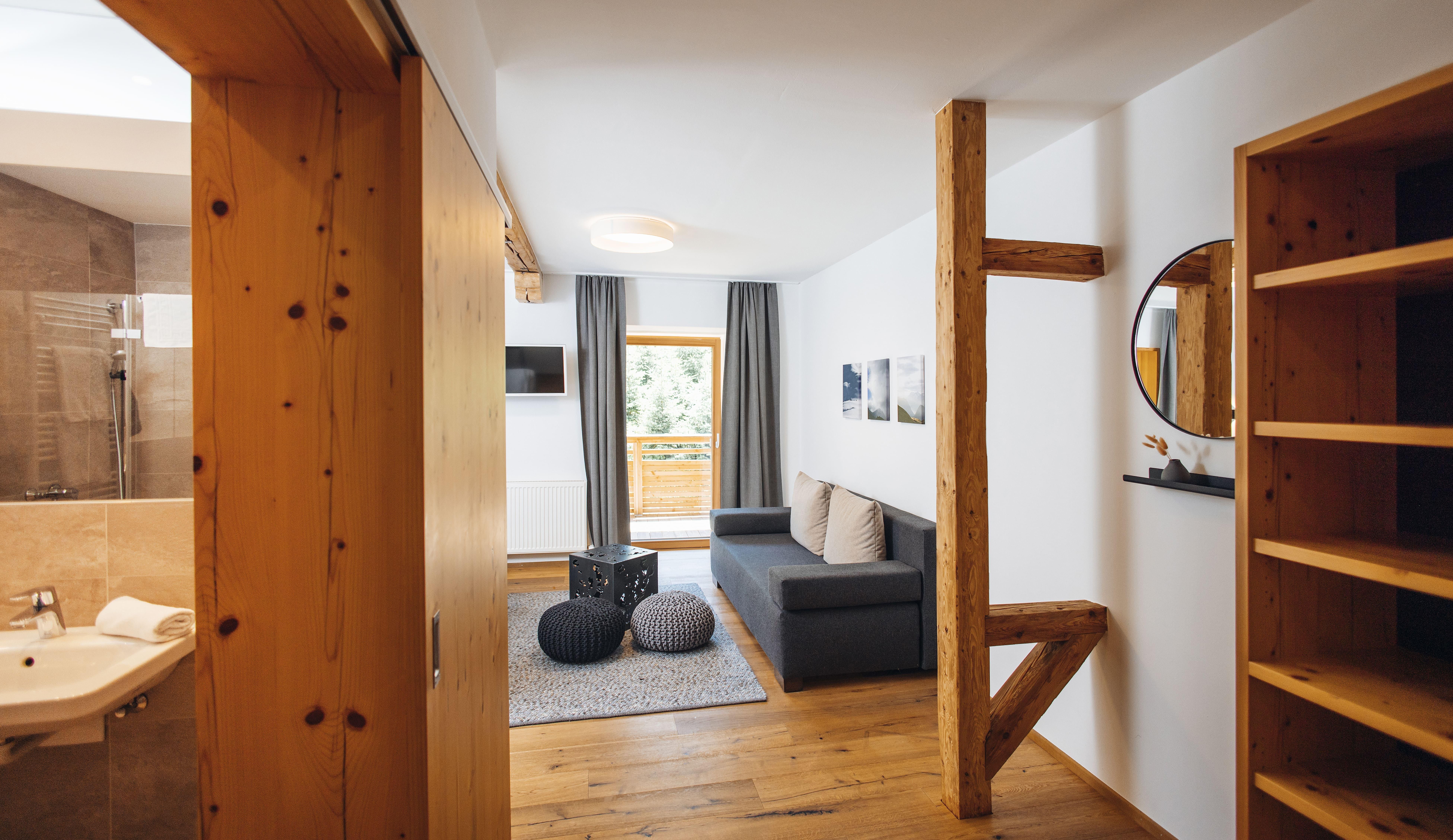 Das Ap. Johann bietet Platz für 2–4 Personen. Es verfügt über 2Schlafzimmer mit Boxspringbetten und eine Zirbenstube mit Tiroler Kachelofen. Hochwertige Materialien aus der Region wie Zirbenholz, Schafwollteppiche und Loden sorgen für alpinen Charme.