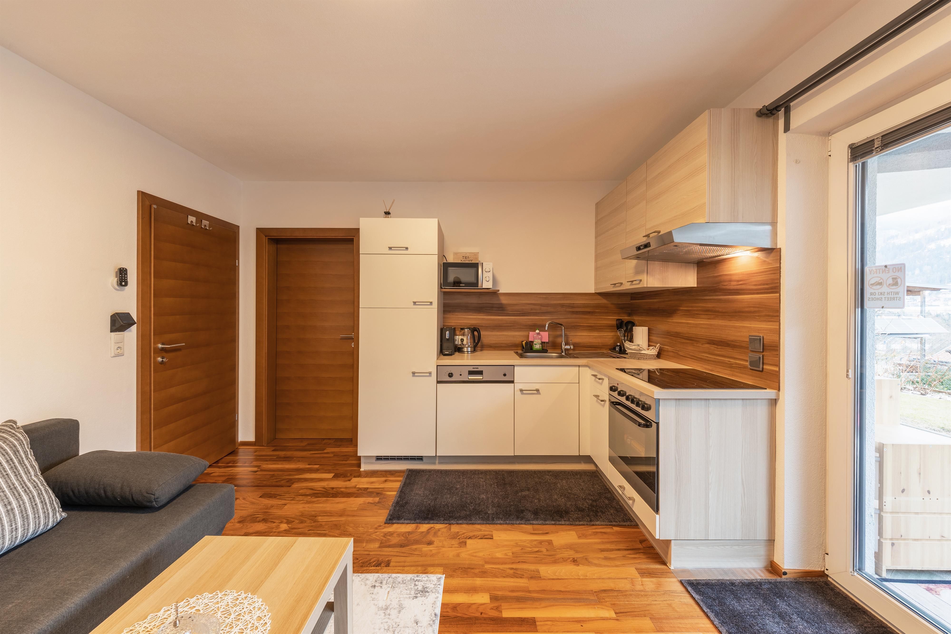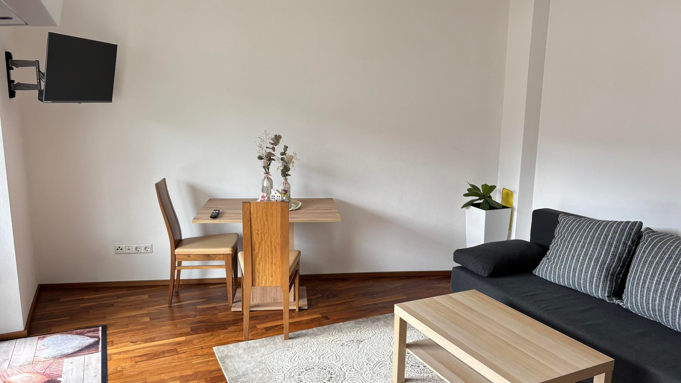 Auf 40 m² erwarten Sie ein helles Doppelzimmer, eine voll ausgestattete Wohnküche (Backrohr, Geschirrspüler, Kaffemaschine) mit Schlafcouch für 2 Personen,