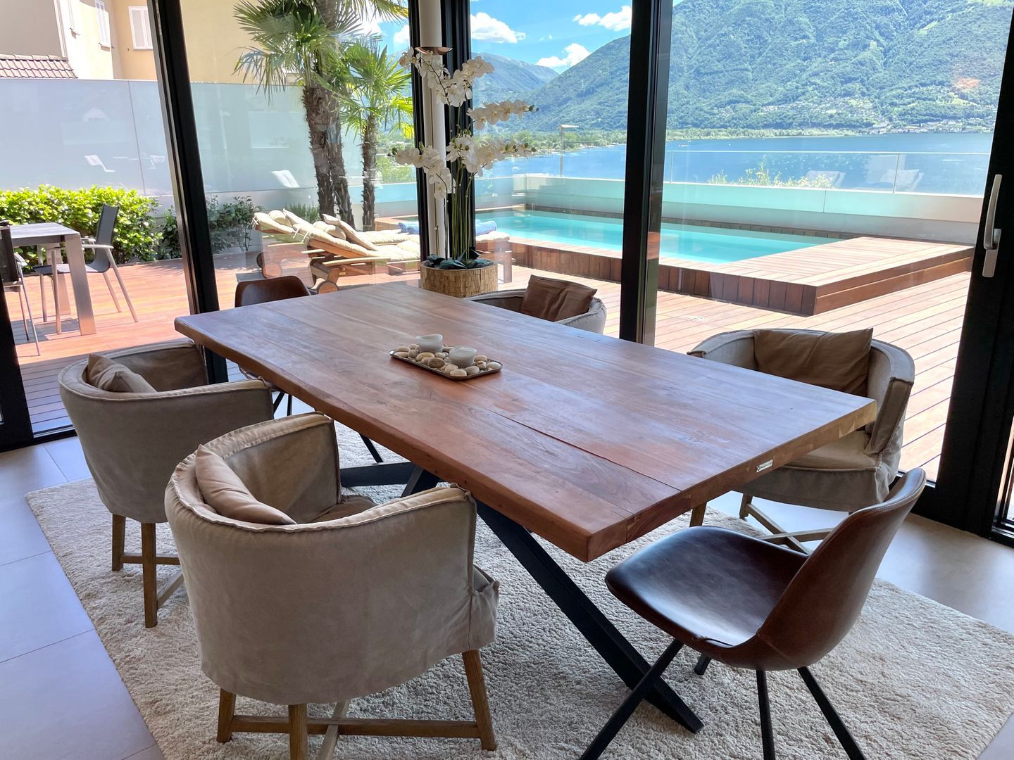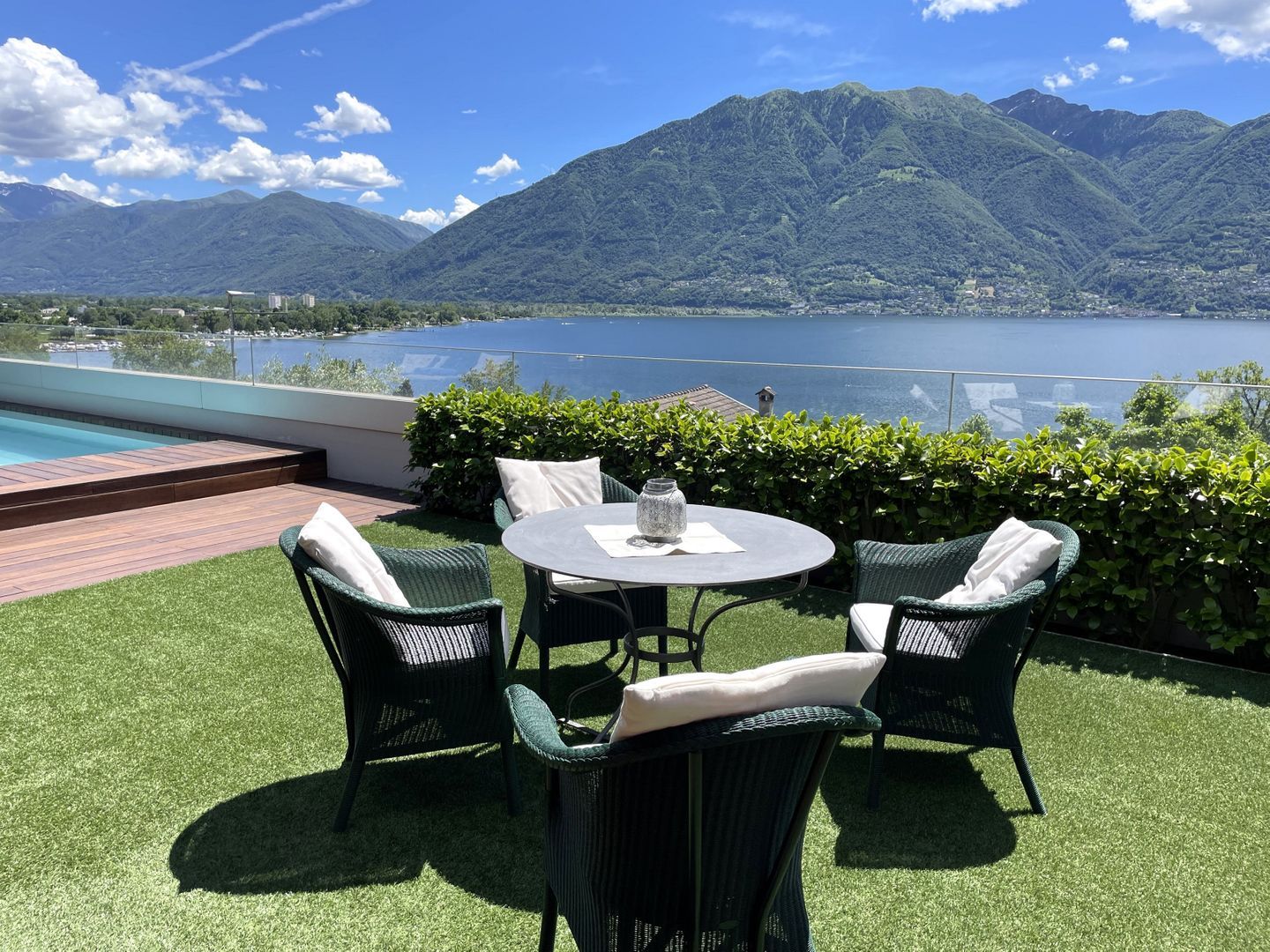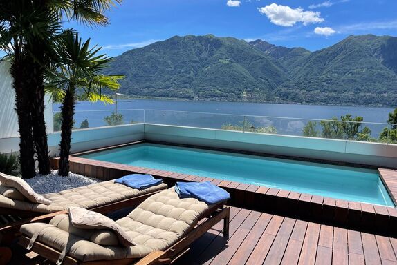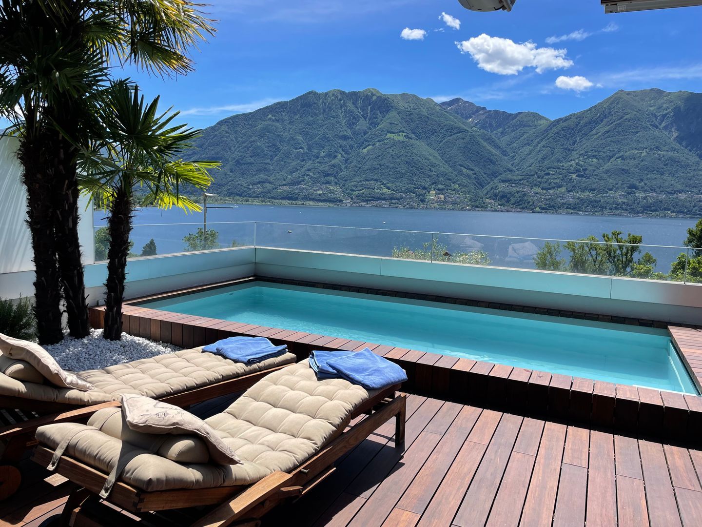Nutzen Sie an warmen Tagen die grosszügige Terrasse mit Lounge und grossem Esstisch für Mahlzeiten im Freien. Machen Sie es sich bequem am eigenen Pool und geniessen Sie die herrliche Sicht über den Lago Maggiore. Ein reservierter Autoabstellplatz befindet sich in der Tiefgarage.