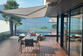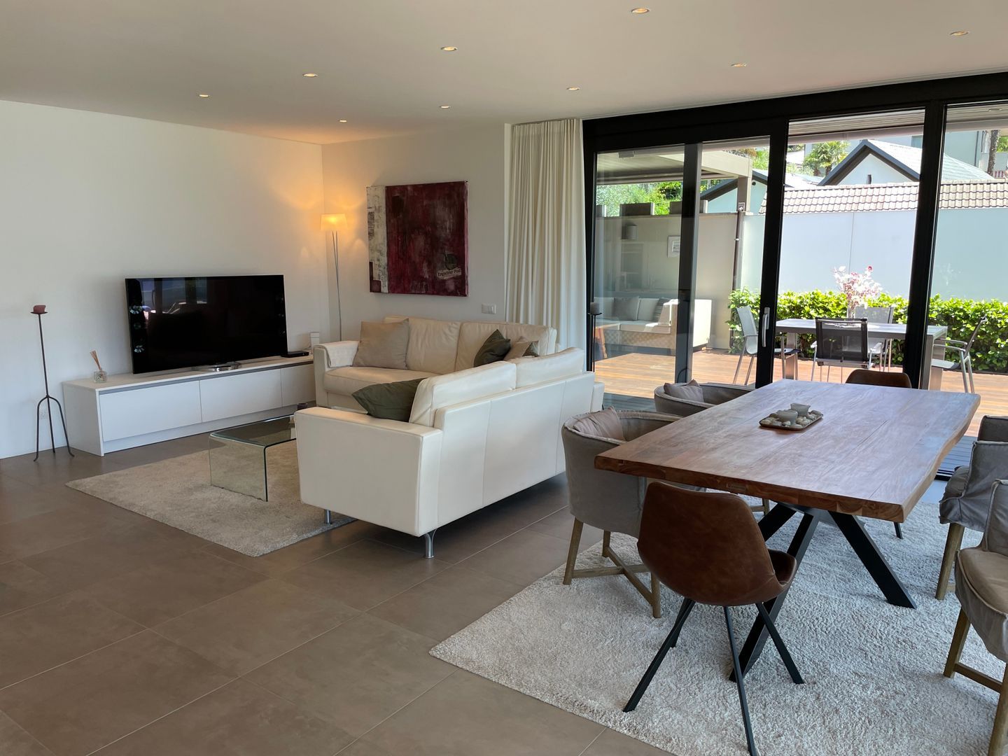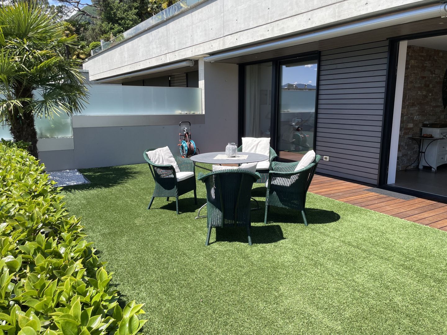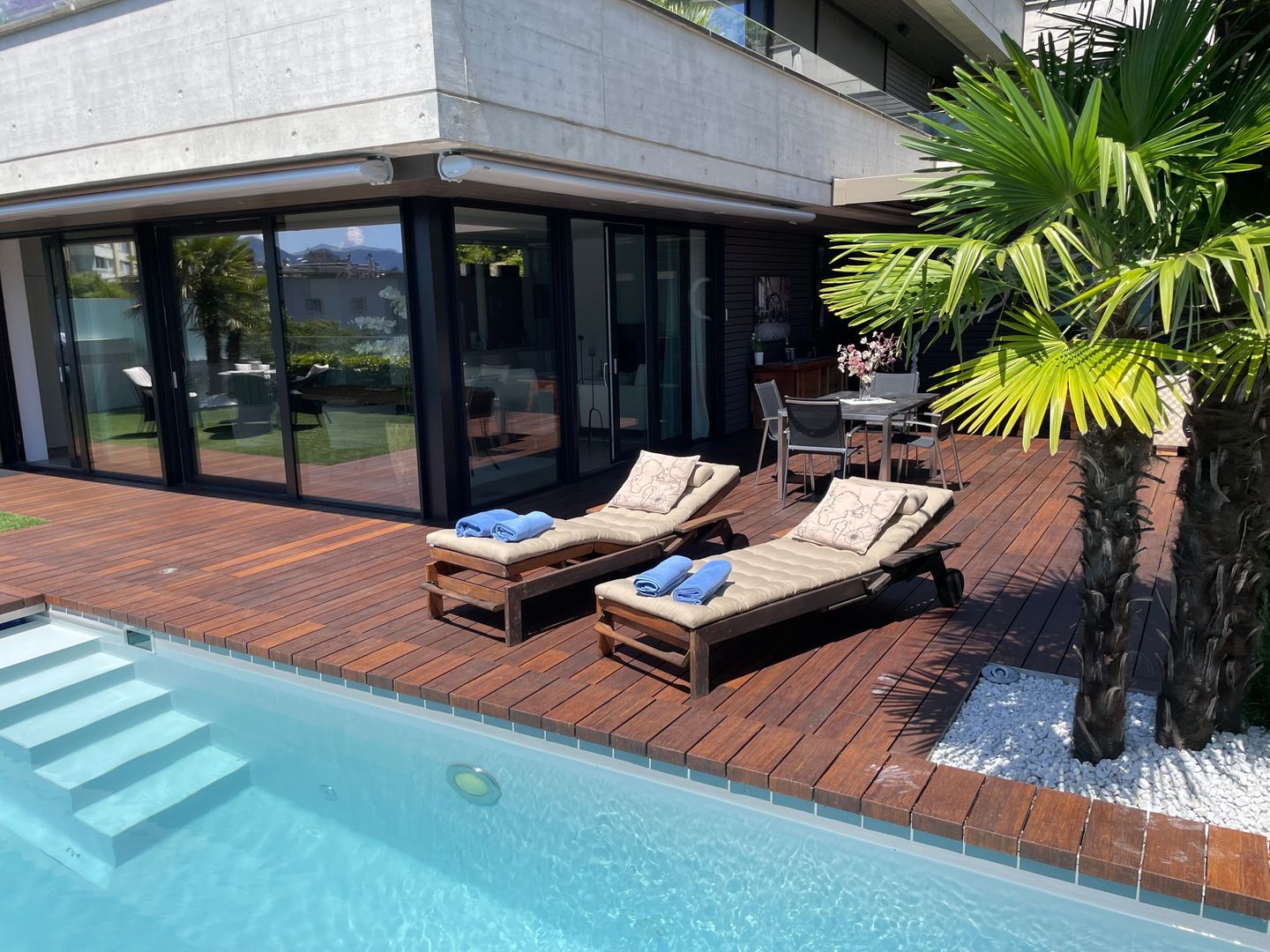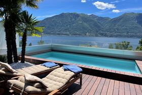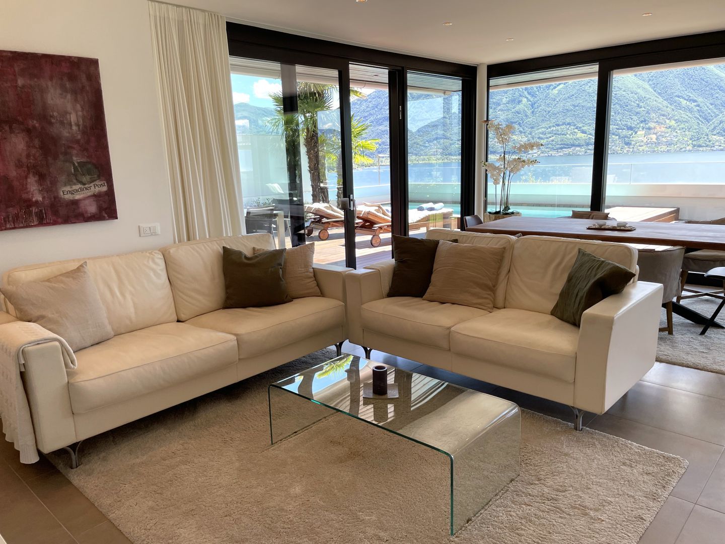 Nutzen Sie an warmen Tagen die grosszügige Terrasse mit Lounge und grossem Esstisch für Mahlzeiten im Freien. Machen Sie es sich bequem am eigenen Pool und geniessen Sie die herrliche Sicht über den Lago Maggiore. Ein reservierter Autoabstellplatz befindet sich in der Tiefgarage.