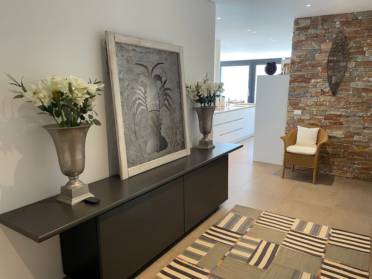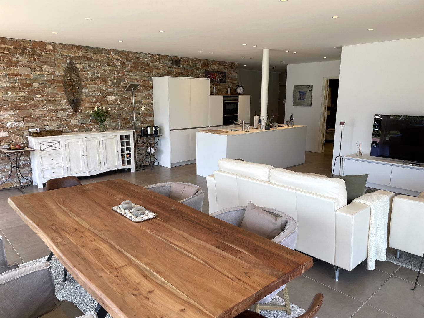 Entdecken Sie ein geräumiges, modern eingerichtetes Wohn- Esszimmer mit gemütlicher Sofagarnitur, Esstisch und offener Küche mit Kochinsel die mit hochmodernen Geräten ausgestattet ist.