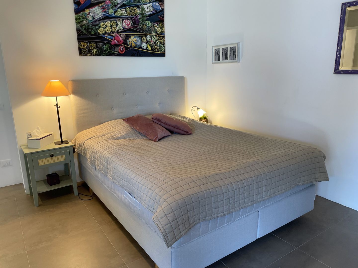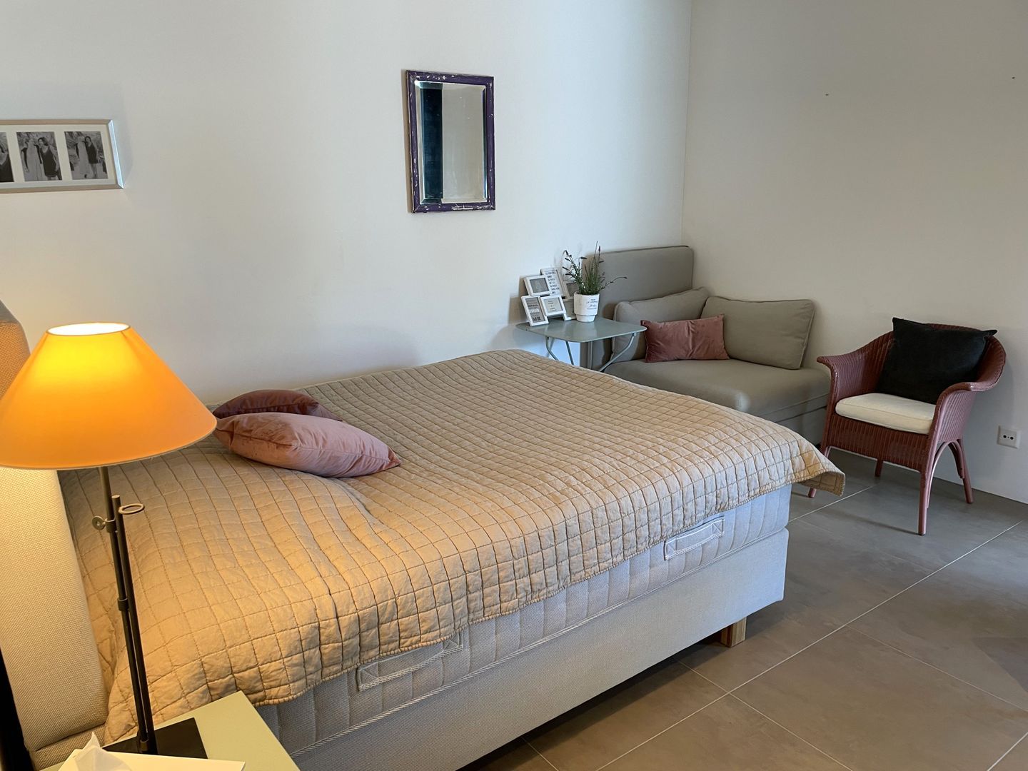 Das Schlafzimmer verfügt über ein Französisches Bett und einen Schlaf Futon sowie Ausgang auf die Terrasse. Exklusives Badezimmer mit Regendusche und WC.