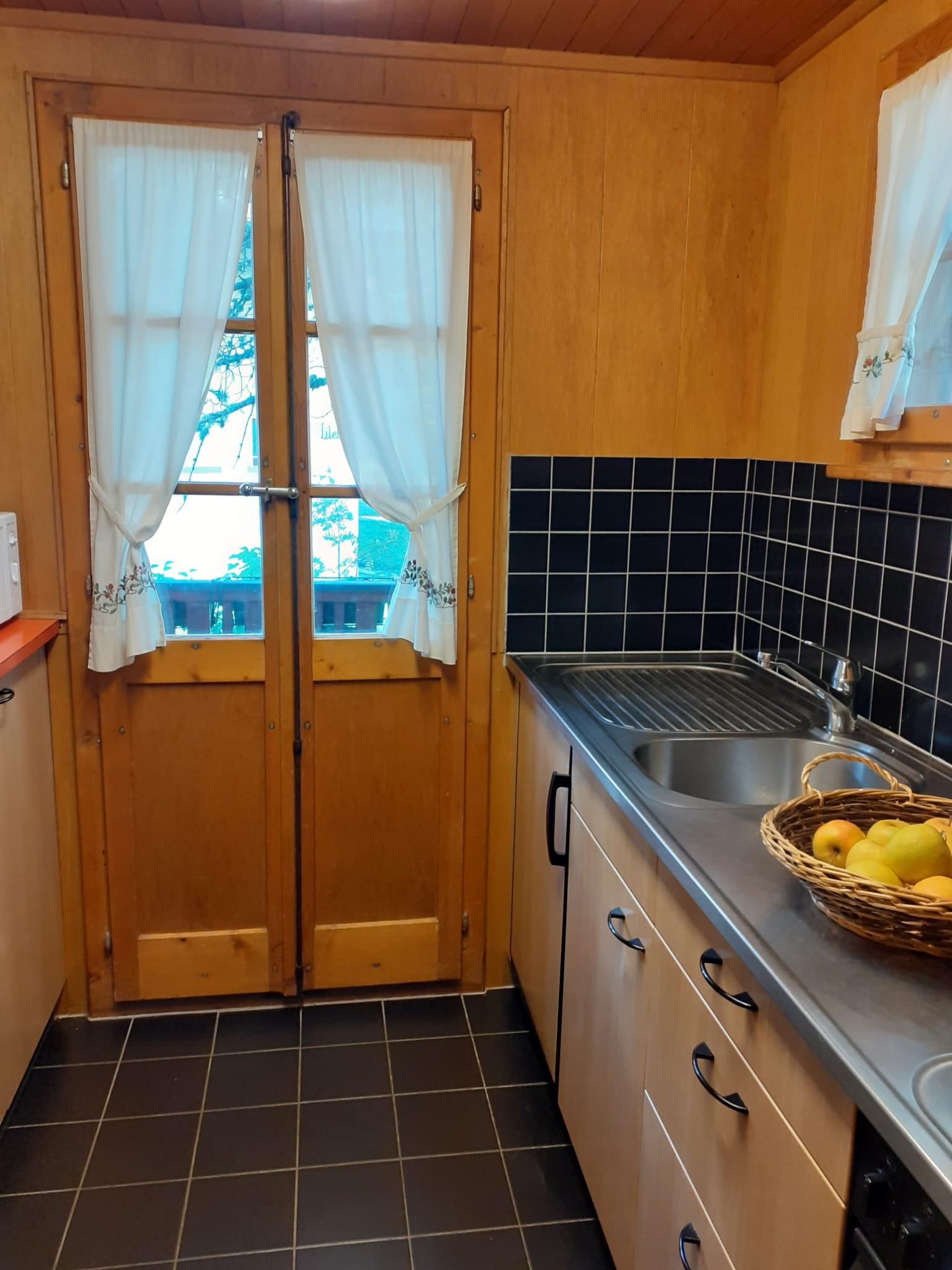 Eine separate Küche mit Zugang zum Balkon und Garten. Die Küche verfügt über einen Elektroherd mit Backofen, einen Kühl- und Gefrierschrank, eine Mikrowelle, einen Wasserkocher und eine Espressomaschine.
