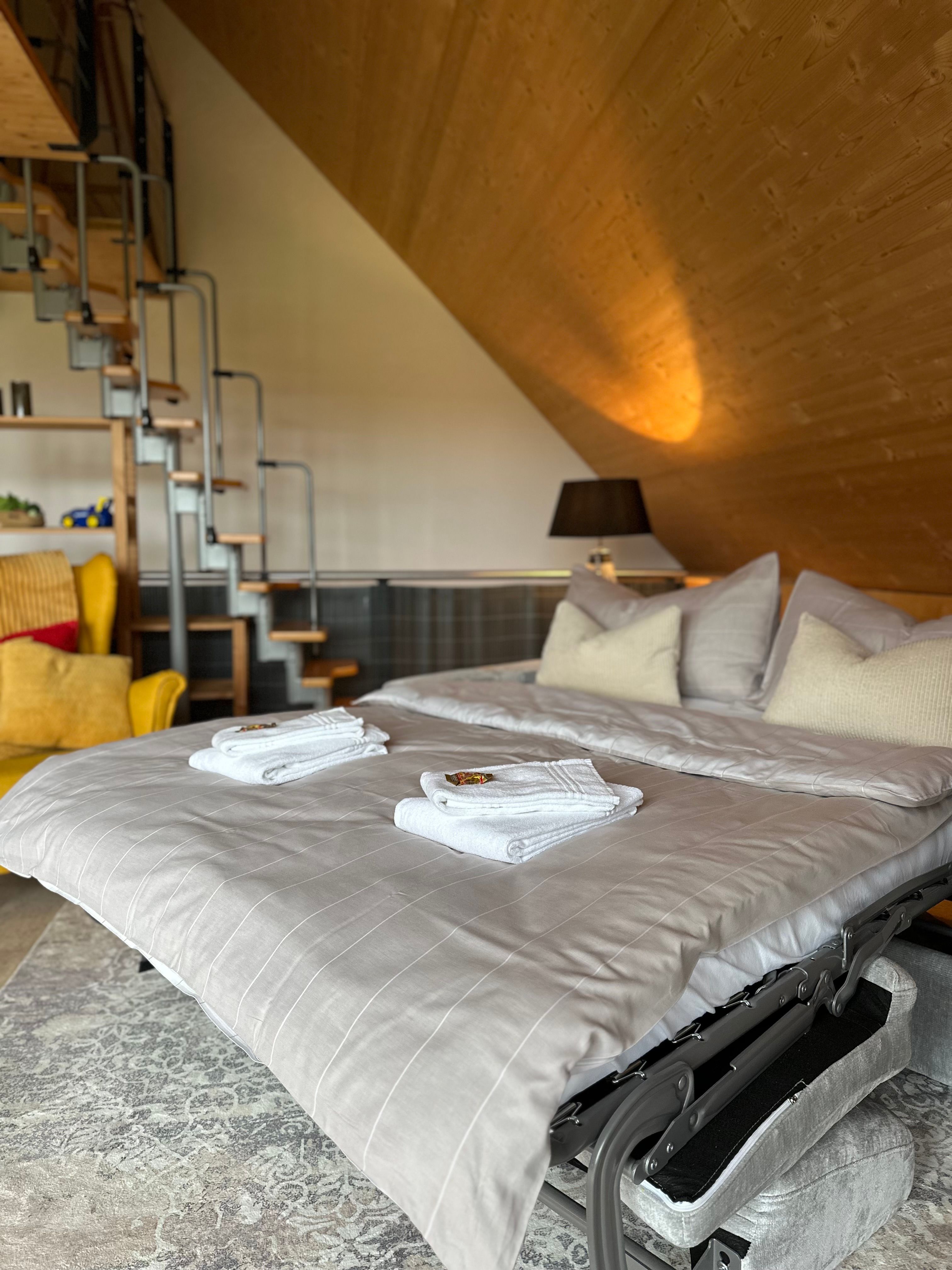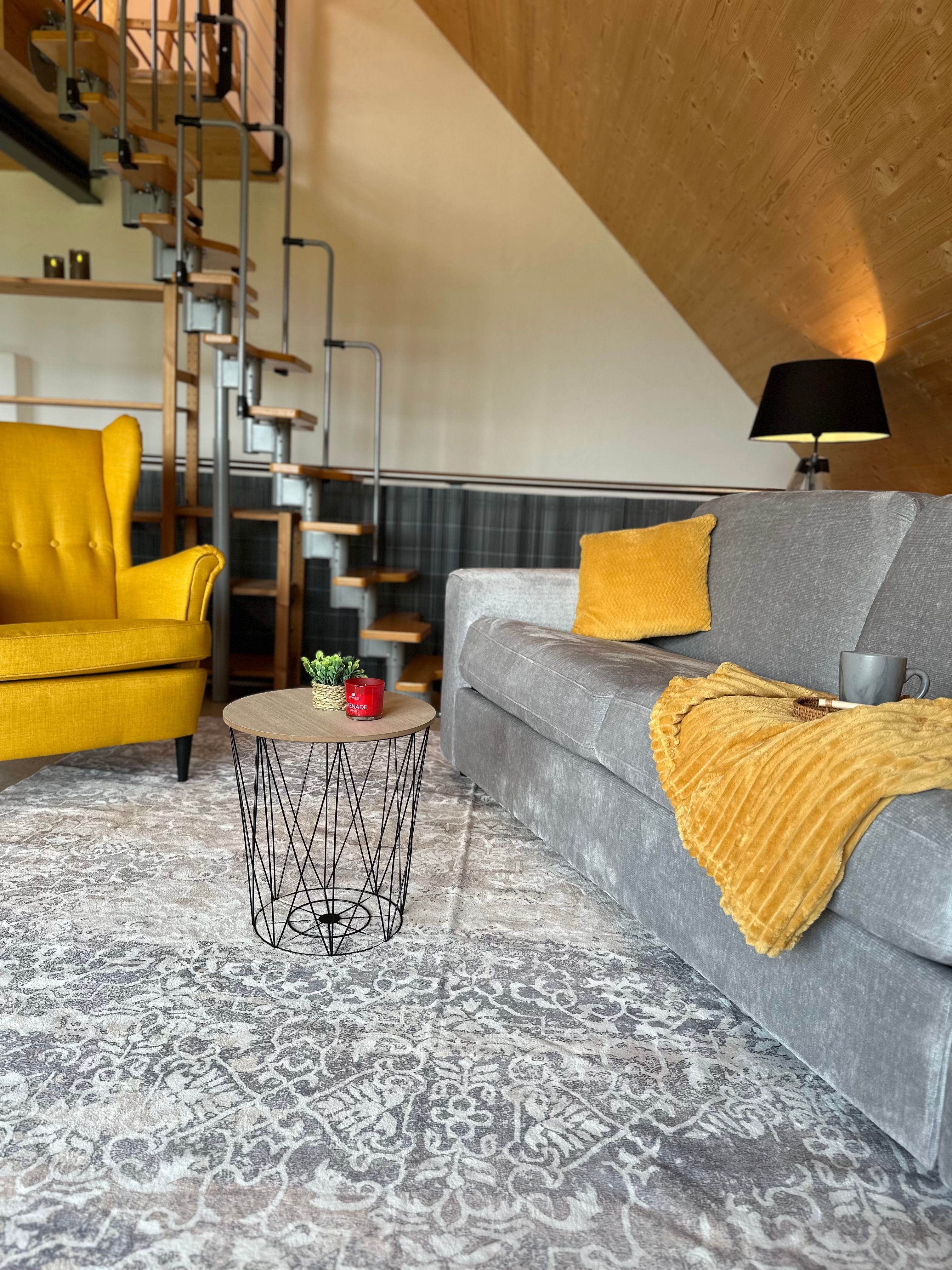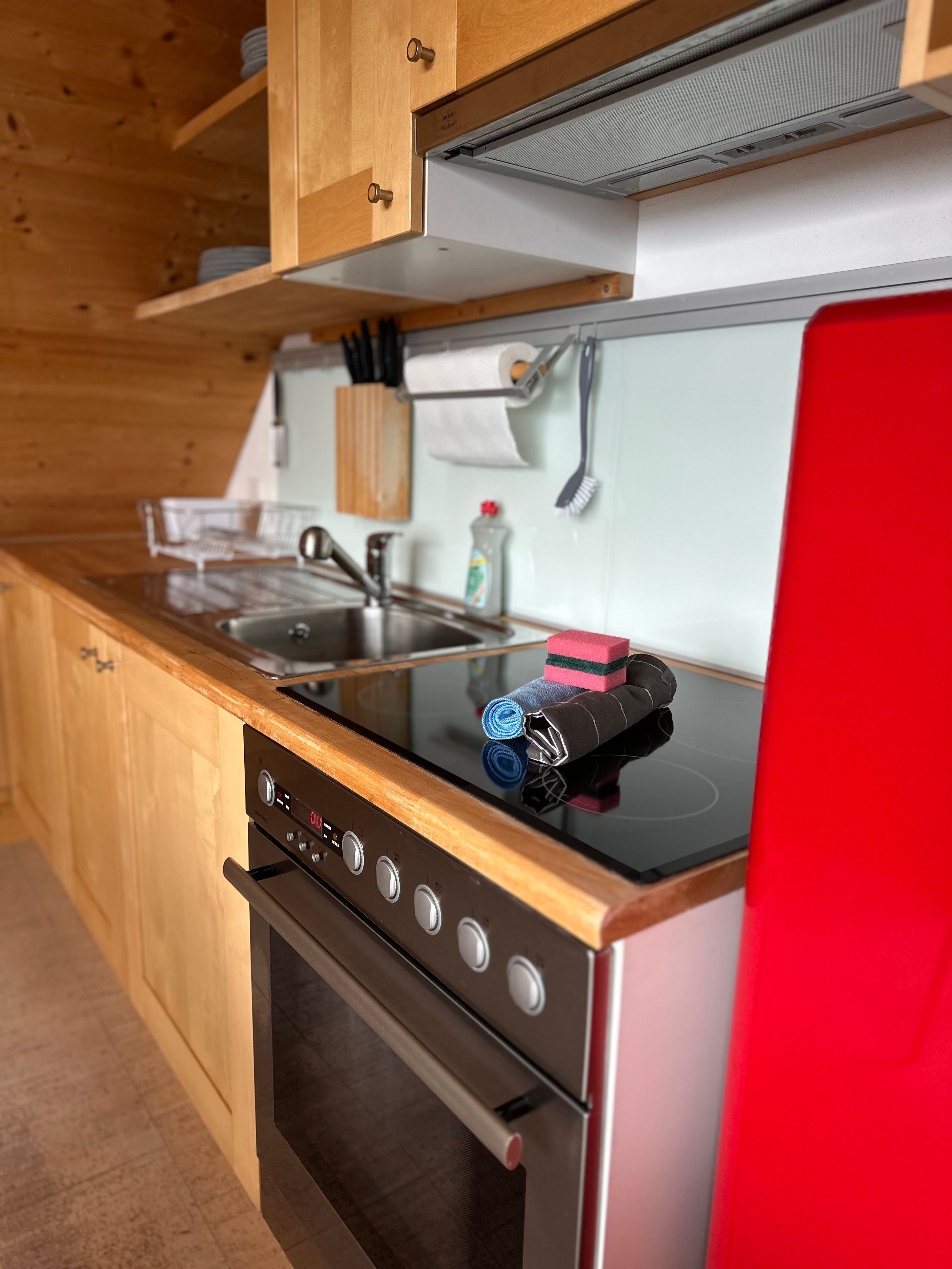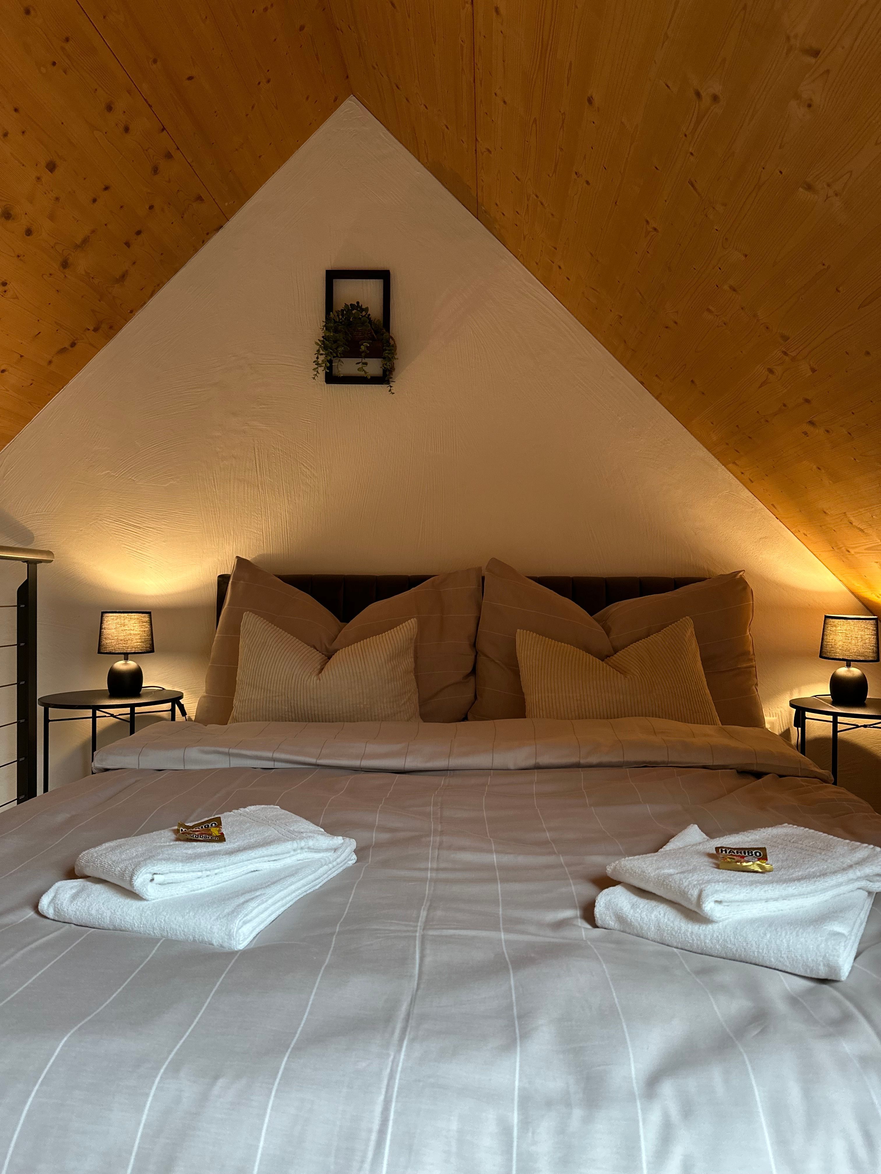 Im Inneren erwarten Sie auf drei Etagen verteilt gemütliche und einladende Räumlichkeiten. Beginnen Sie im unteren Bereich, wo sich ein behagliches Zimmer mit Doppelbett befindet. Eine Etage höher gelangen Sie in den Wohn- und Essbereich, der neben einer Schlafmöglichkeit für zwei weitere Personen auf einem komfortablen Schlafsofa auch einen Esstisch für sechs Personen bietet. Die Küche ist voll ausgestattet und lässt keine Wünsche offen für die Zubereitung köstlicher Mahlzeiten. Über dem Wohnzimmer befindet sich die Galerie, auch hier mit einem komfortablen Doppelbett ausgestattet.