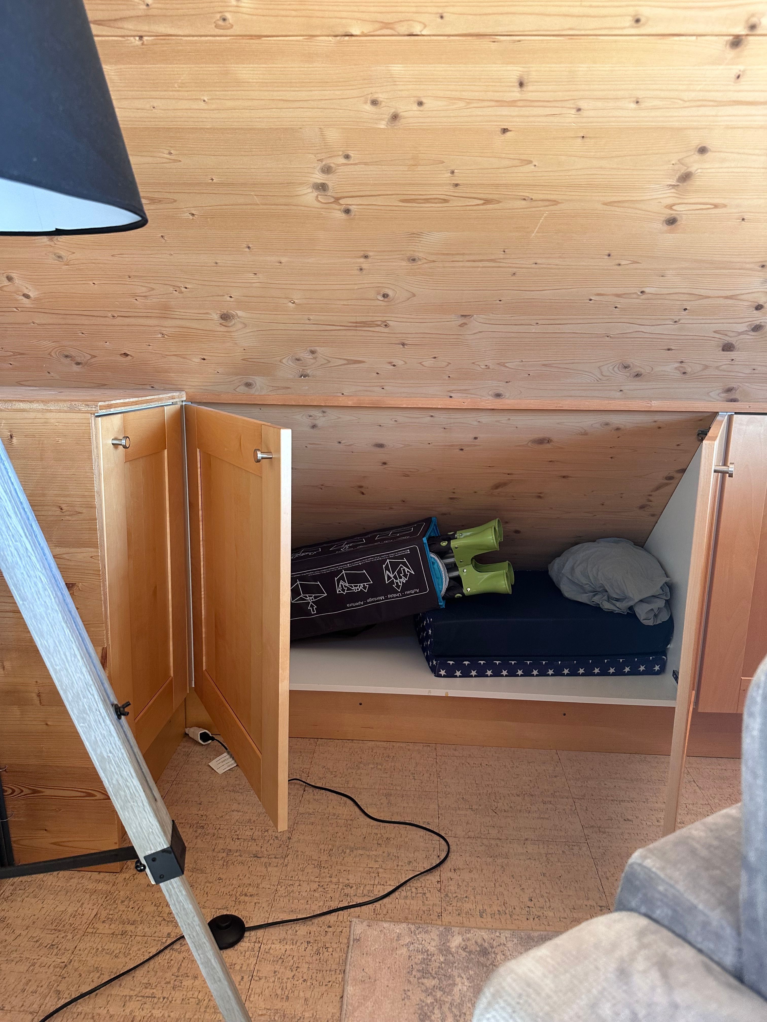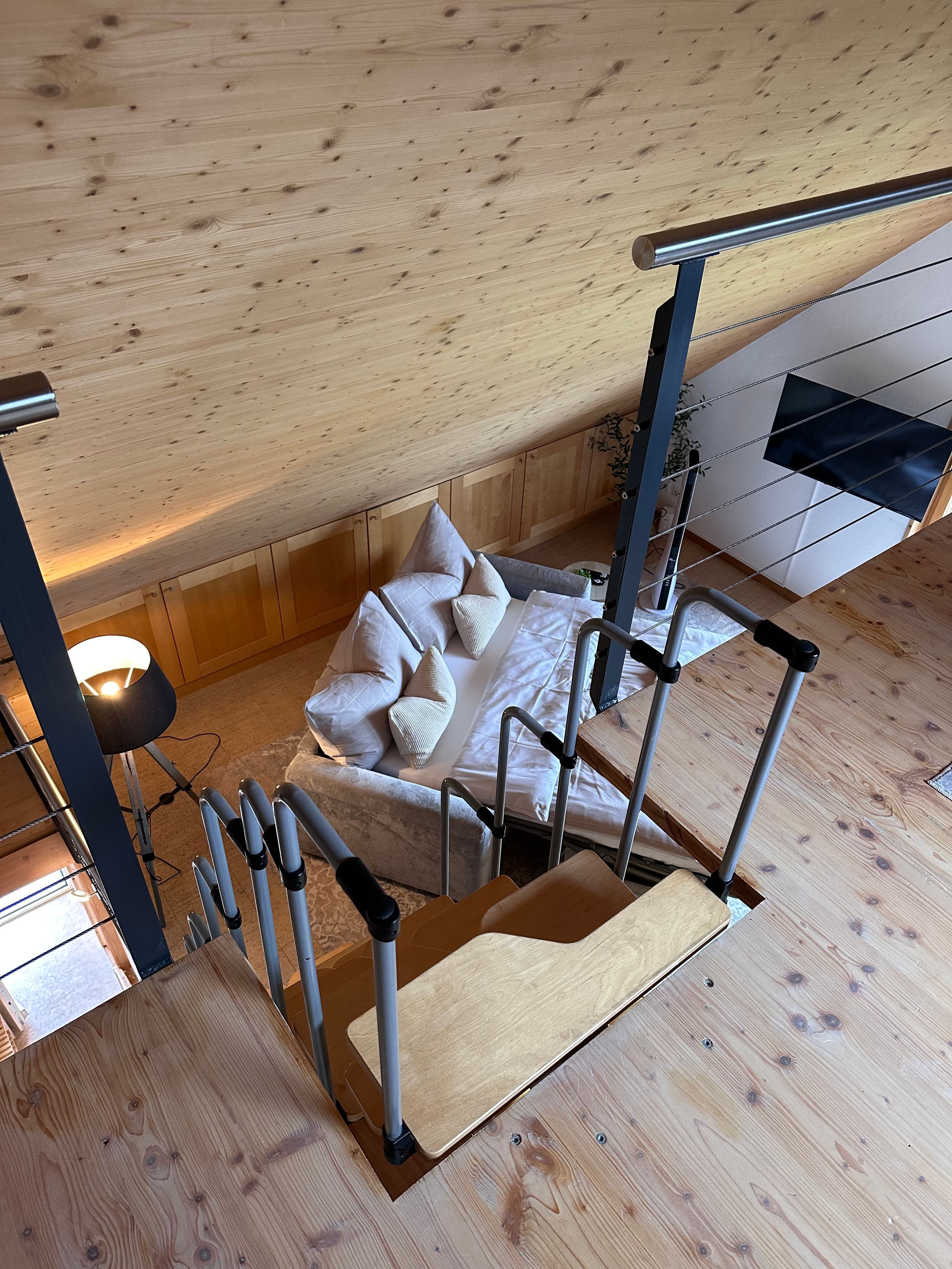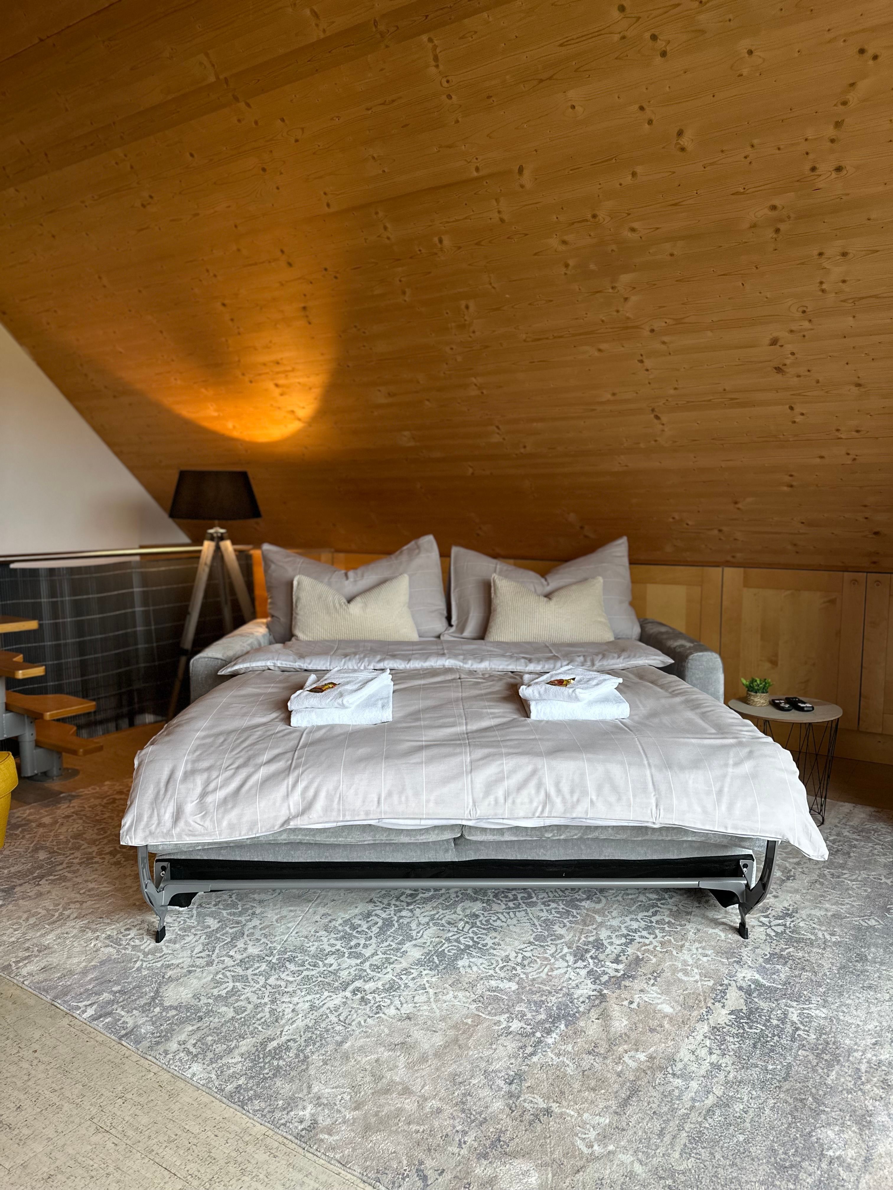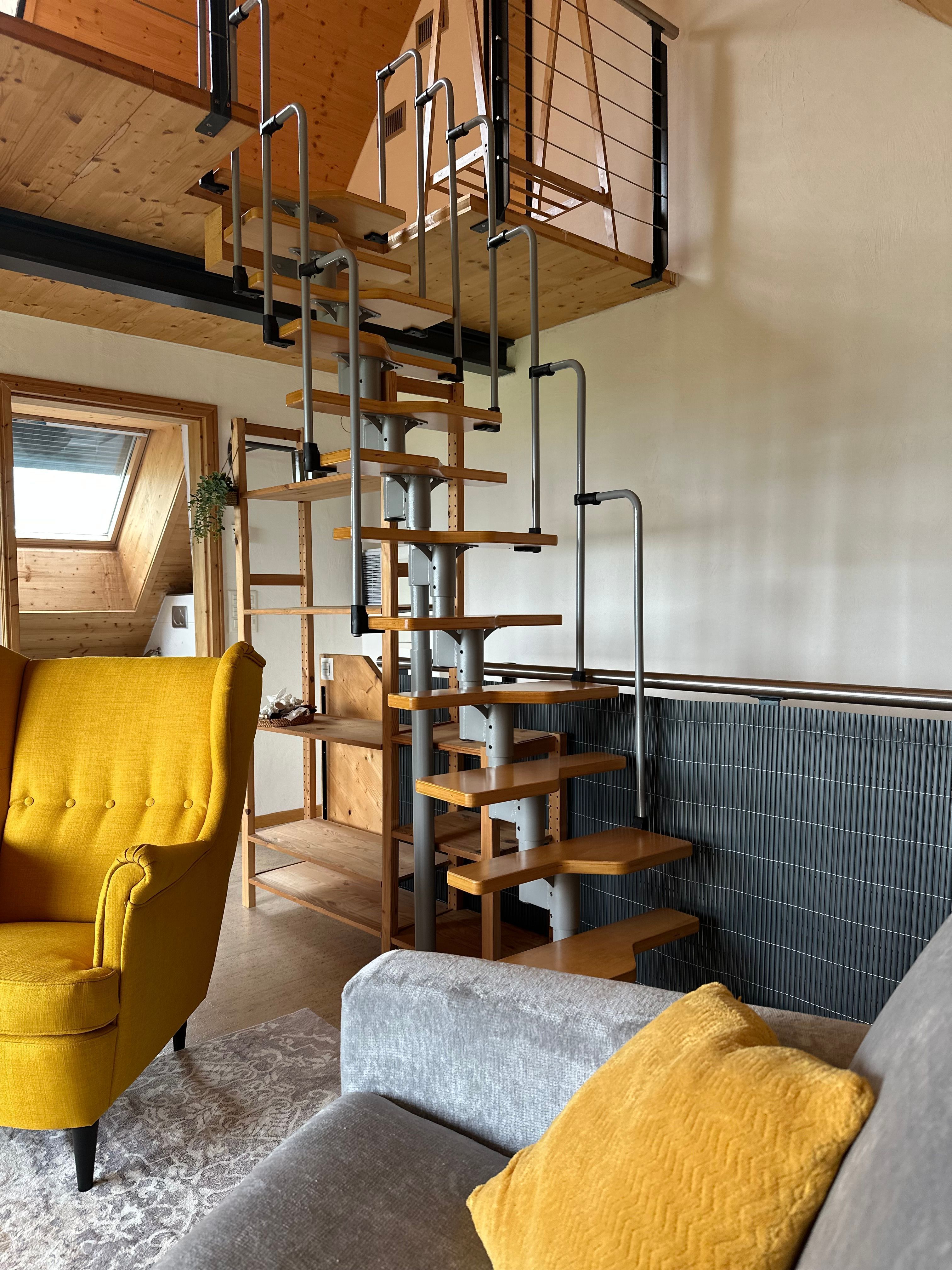 Im Inneren erwarten Sie auf drei Etagen verteilt gemütliche und einladende Räumlichkeiten. Beginnen Sie im unteren Bereich, wo sich ein behagliches Zimmer mit Doppelbett befindet. Eine Etage höher gelangen Sie in den Wohn- und Essbereich, der neben einer Schlafmöglichkeit für zwei weitere Personen auf einem komfortablen Schlafsofa auch einen Esstisch für sechs Personen bietet. Die Küche ist voll ausgestattet und lässt keine Wünsche offen für die Zubereitung köstlicher Mahlzeiten. Über dem Wohnzimmer befindet sich die Galerie, auch hier mit einem komfortablen Doppelbett ausgestattet.