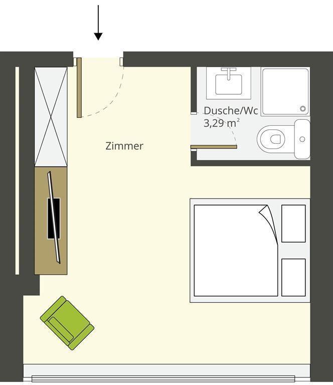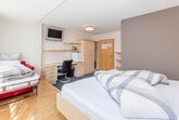 Zimmer mit einem Doppelbett und einem Schlafsofa für eine weitere Person mit einem Badezimmer mit Dusche/WC. Größe ca. 18 m².