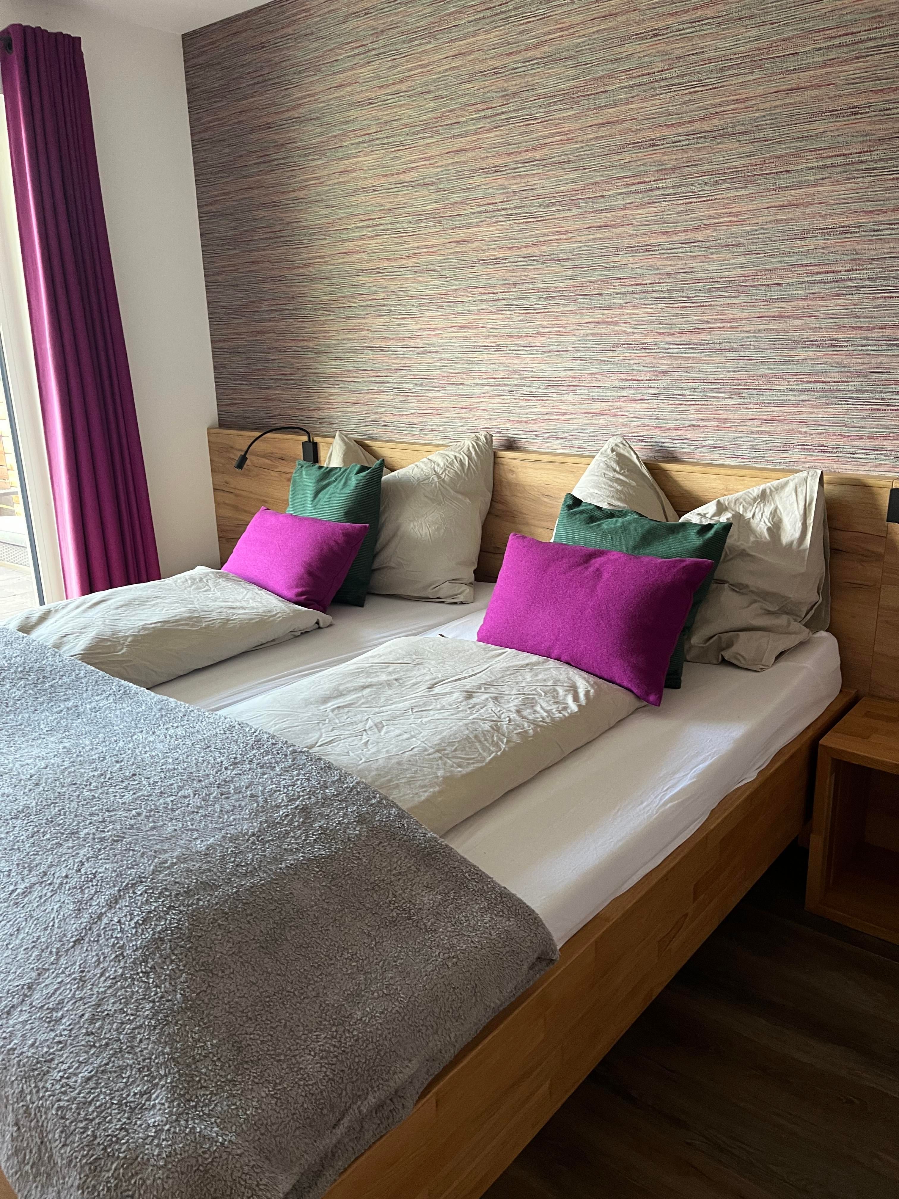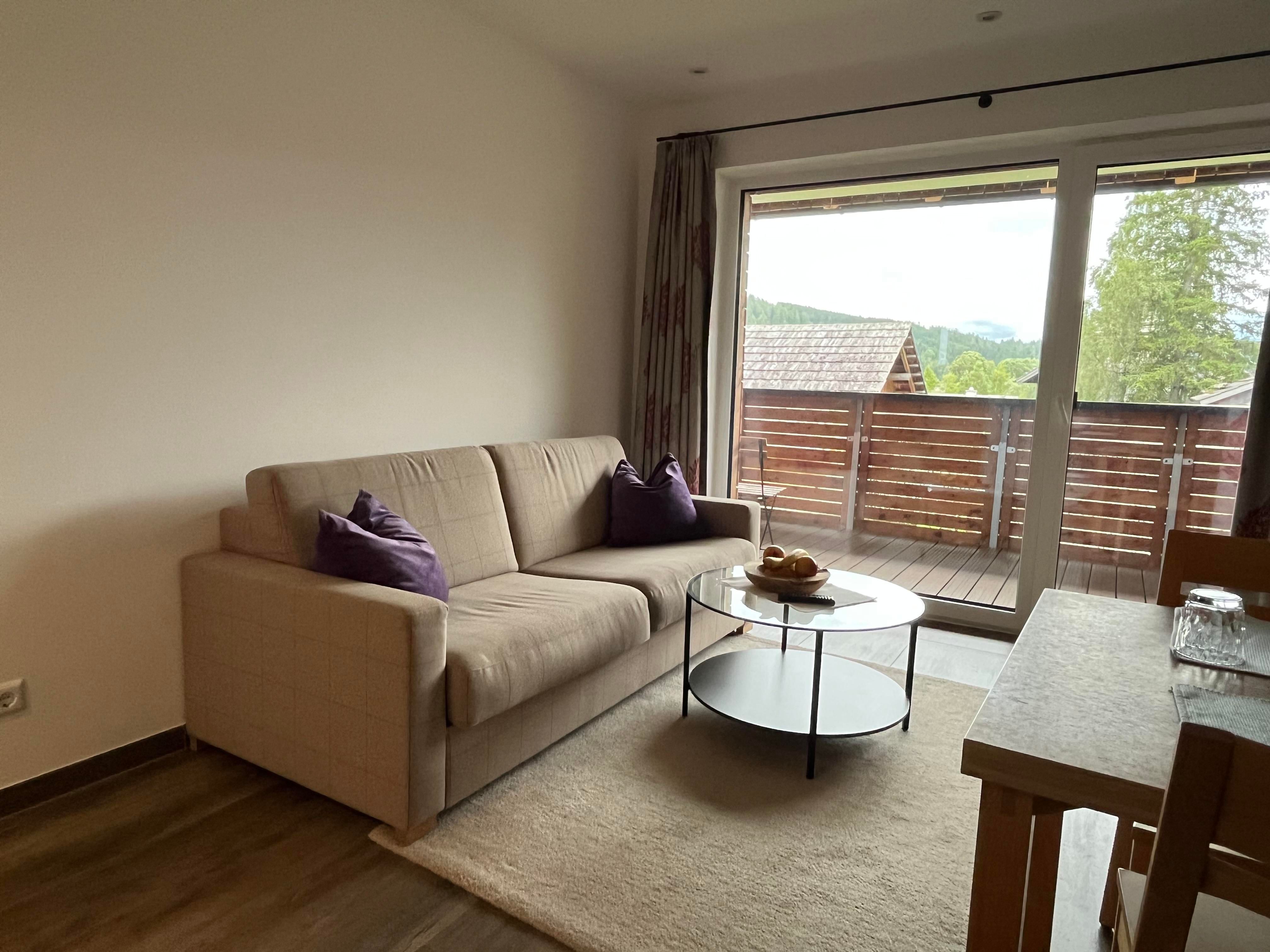 Die Appartements überzeugen mit hellen, lichtdurchfluteten Räumen, einem offenen Koch-, Ess- und Wohnbereich mit gemütlicher Schlafcouch sowie direktem Zugang zu Balkon oder Garten. Von dort hast du einen traumhaften Blick auf die umliegende Bergwelt. Das großzügige 3-Zimmer-Appartement bietet dir zwei Schlafzimmer – eines davon mit Etagenbett – und ein modernes Badezimmer mit Walk-In-Dusche.