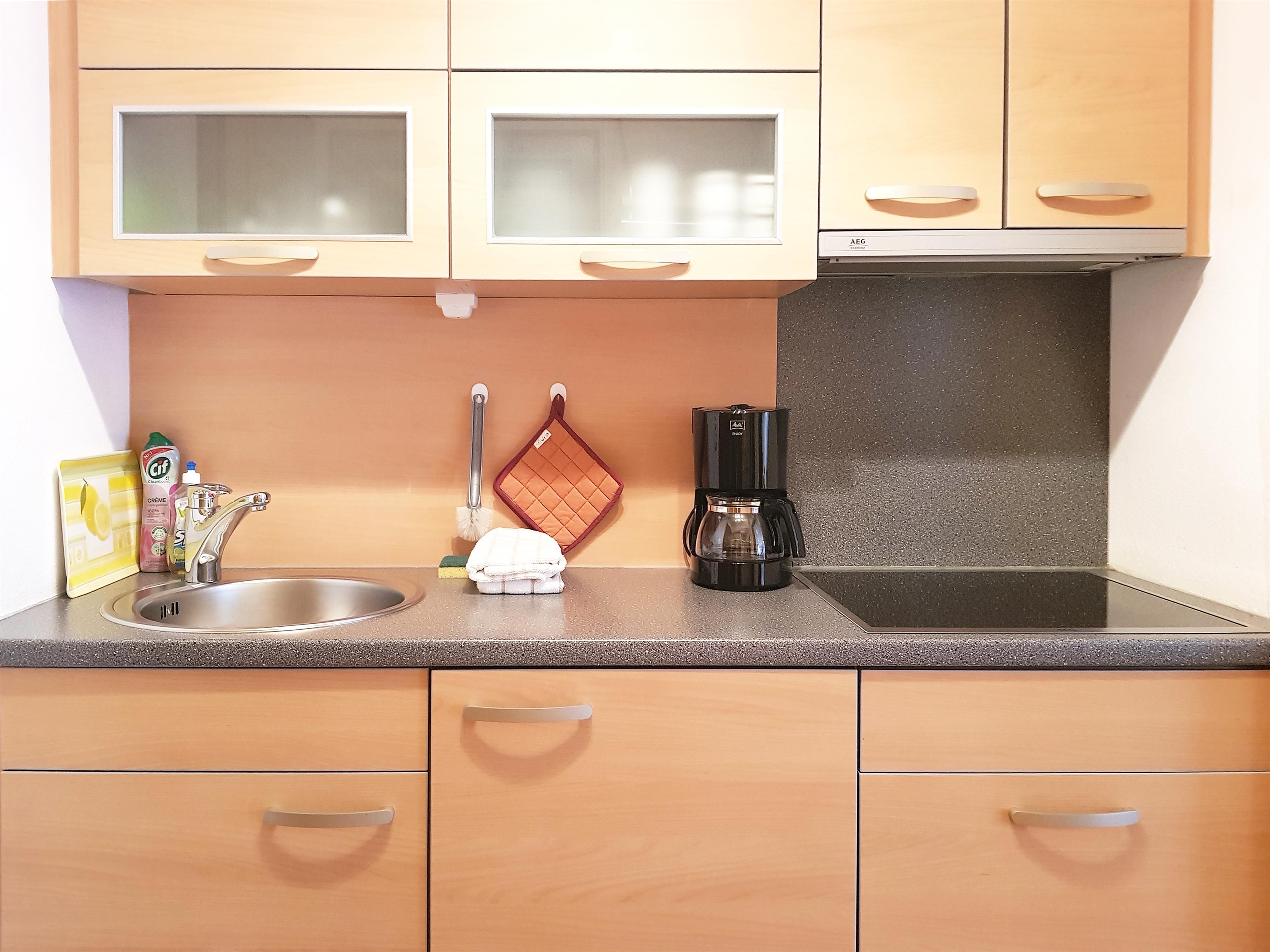 - eine räumlich abgeschlossene Küche mit Kochplatte, Kühlschrank, Spülbecken, Dunstabzug, Kaffeemaschine, Mikrowelle, Geschirr, Gläser, Besteck und Koch- und Spülutensilien;