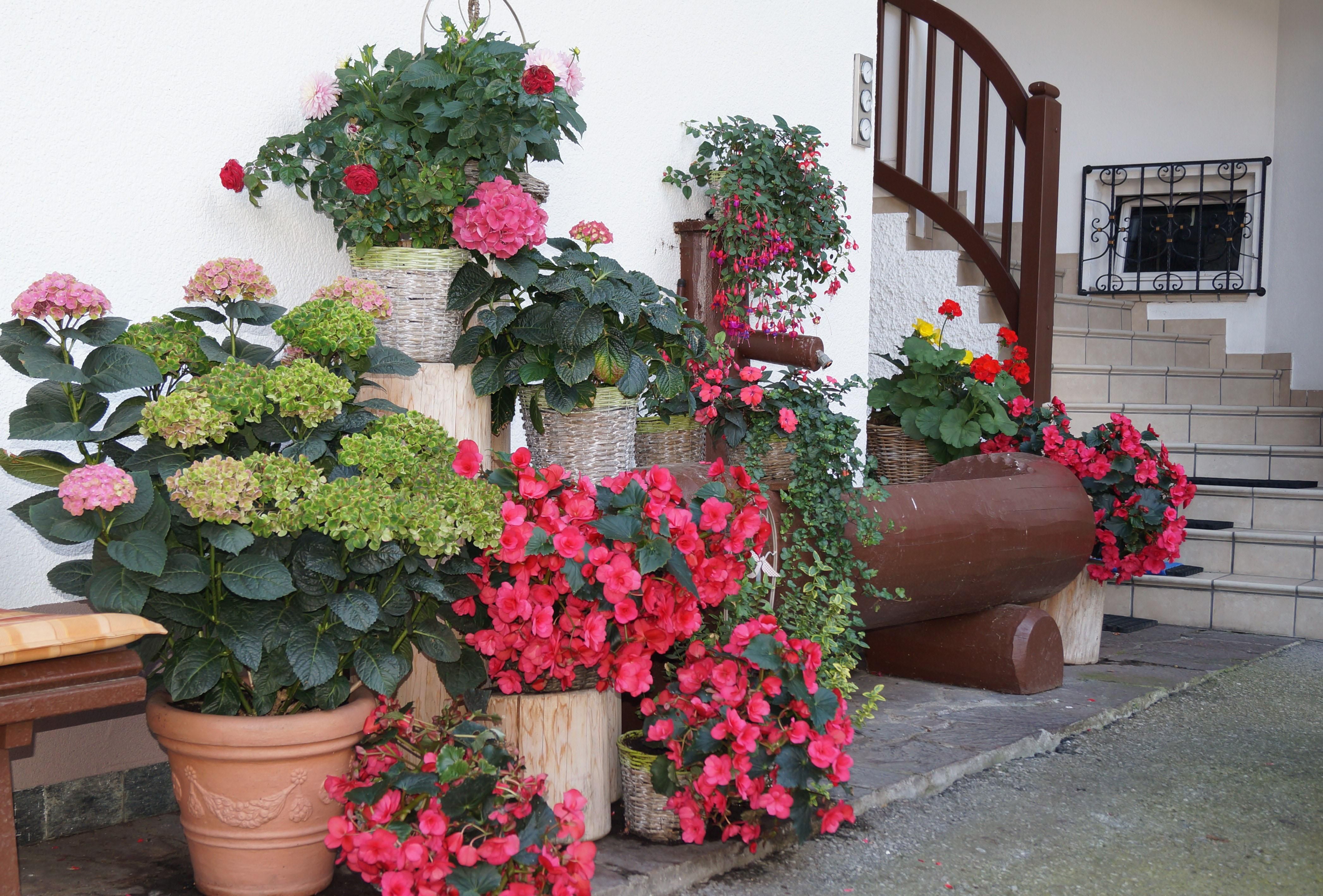 - einen Balkon mit Stühlen, Tisch und Sonnenschirm.