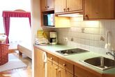 - eine Kleinküche mit Kochplatte, Kühlschrank, Spülbecken, Dunstabzug, Kaffeemaschine, Mikrowelle, Geschirr, Gläser, Besteck und Koch- und Spülutensilien;