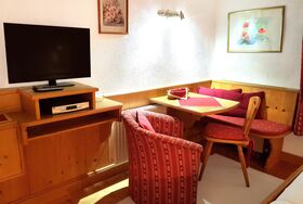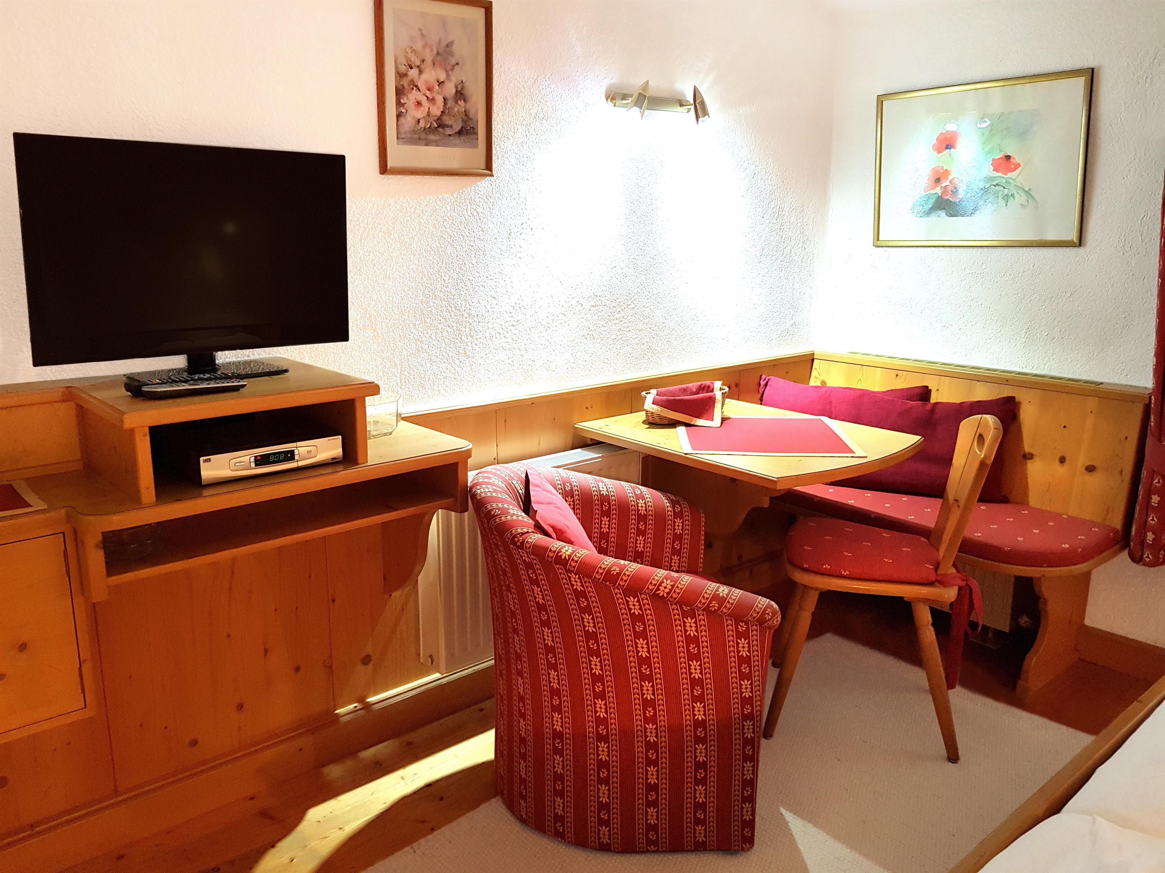 - einen Schlafraum mit Doppelbett und gemütlicher Sitzecke, SAT-TV, Radio und Zimmersafe;