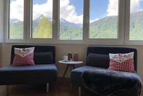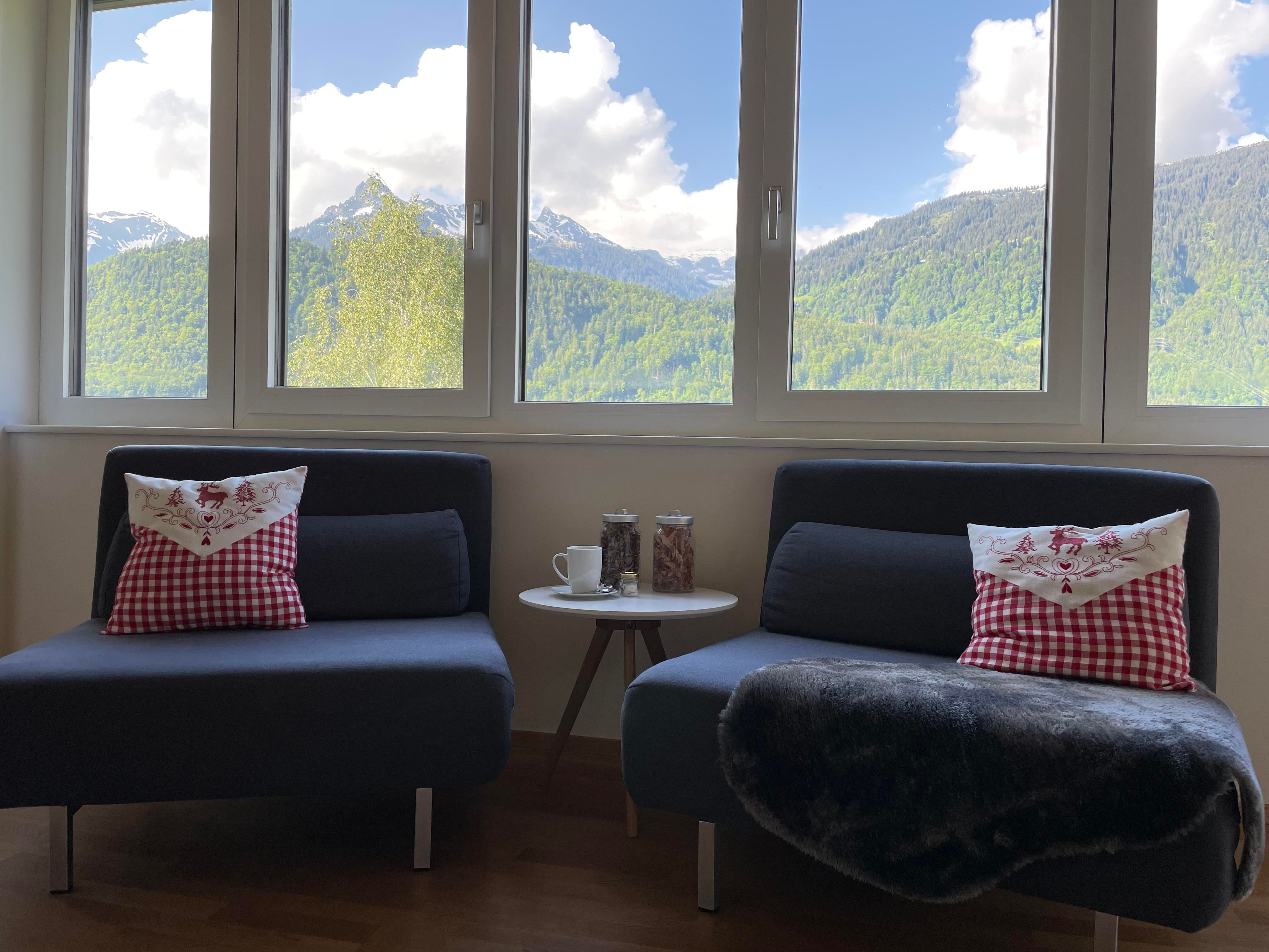 Durch große Panoramafenster könnt Ihr euch schon beim Aufwecken von der Sonne kitzeln lassen und am Abend bei einem Glas Wein den Mondschein betrachten. Das atemberaubende Bergpanorama aus jedem Raum genießen, dass bekommt Ihr nur bei uns!