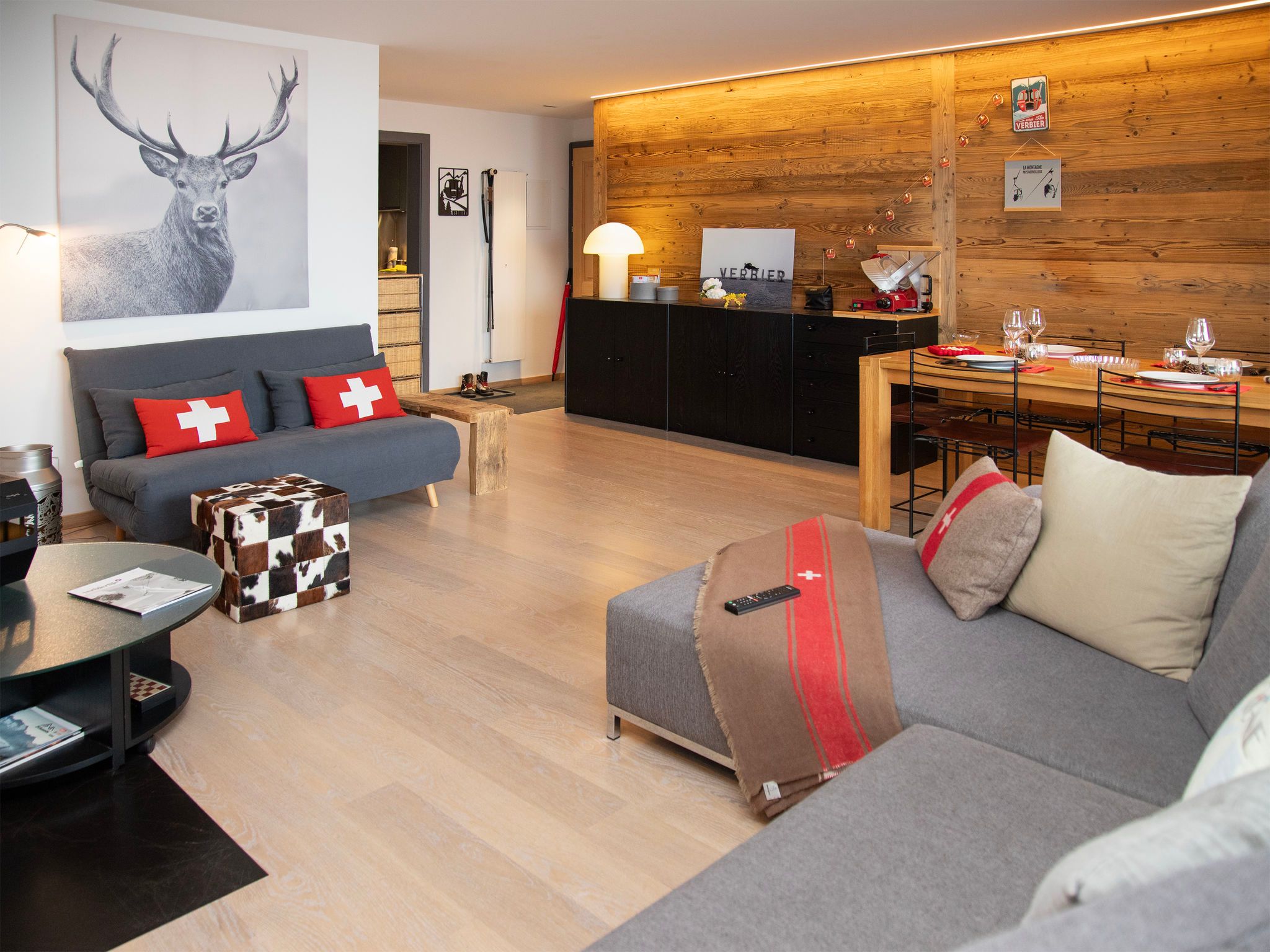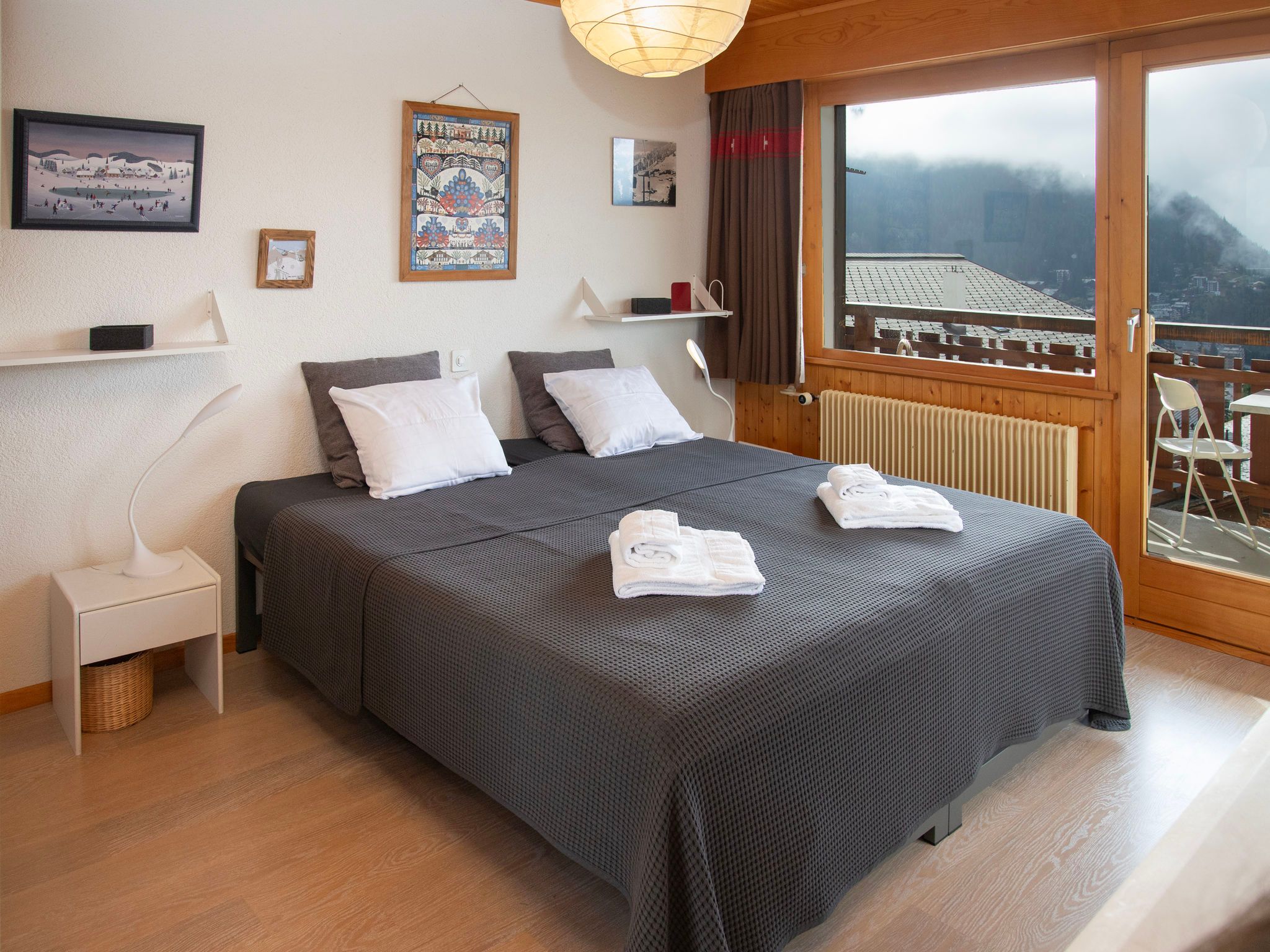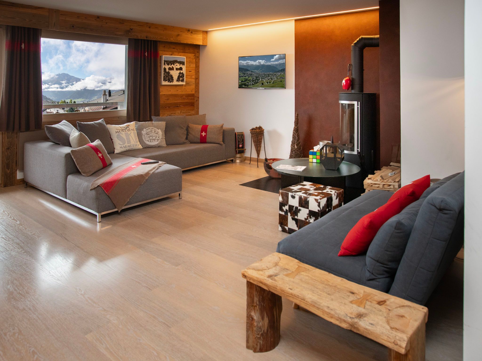 Soleil des Alpes, 3-Zimmer-Wohnung im erhöhten Erdgeschoss, Südlage. Komfortabel und modern eingerichtet: grosses Wohn-/Esszimmer mit Schwedenofen und Kabel-TV. Ausgang zum Balkon, zur Terrasse, Richtung Süden. 1 grosses Zimmer mit 1 Doppelbett (1 x 180 cm, Länge 200 cm), Kabel-TV. Ausgang zur Terrasse. 1 grosses Zimmer mit 2 Betten (90 cm, Länge 200 cm), Kabel-TV. Küche (4 Kochplatten, Backofen, Geschirrspüler, Toaster, Wasserkocher, Mikrowelle, Tiefkühler, elektrische Kaffeemaschine, Kapseln für die Kaffeemaschine (Nespress) extra, Racletteofen, Fondue Set (Käse)). Dusche/WC, sep. WC. Parkettboden. Balkon, Südlage. Balkonmöbel. Sehr schöne Panoramasicht. Zur Verfügung: Haartrockner. Internet (WLAN, gratis). Parkplatz (1 Auto). Bitte beachten: geeignet für Familien. Nichtraucher-Unterkunft.