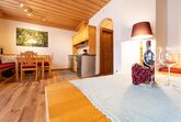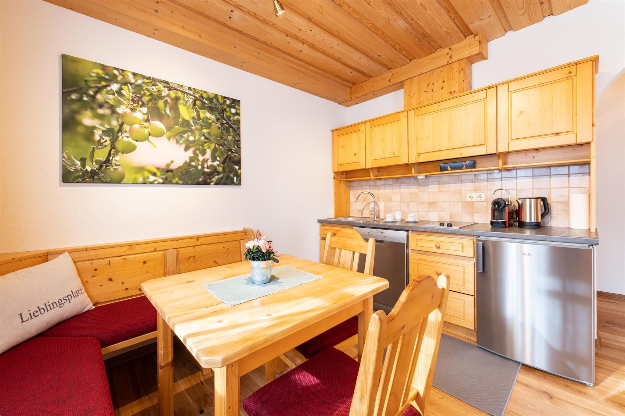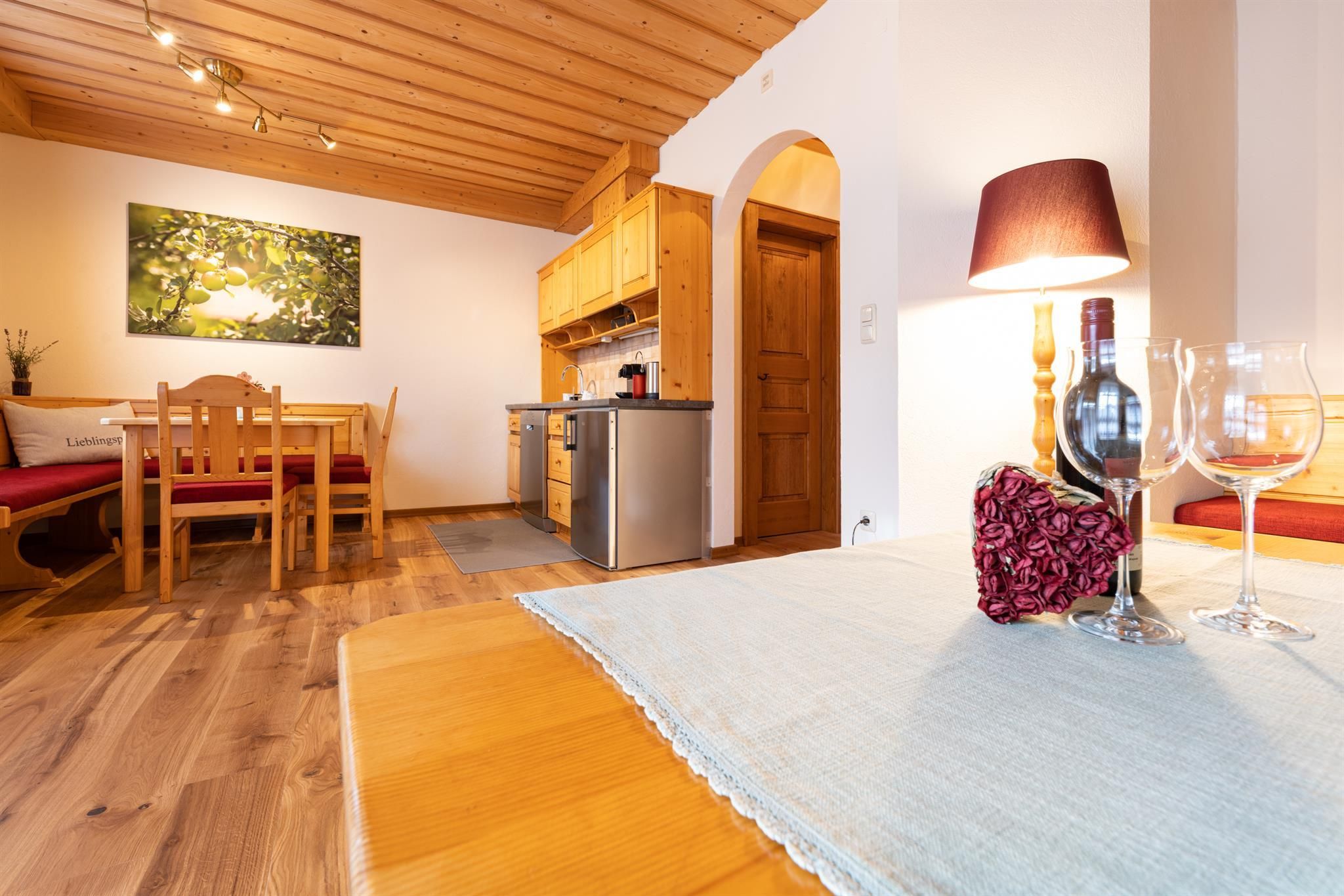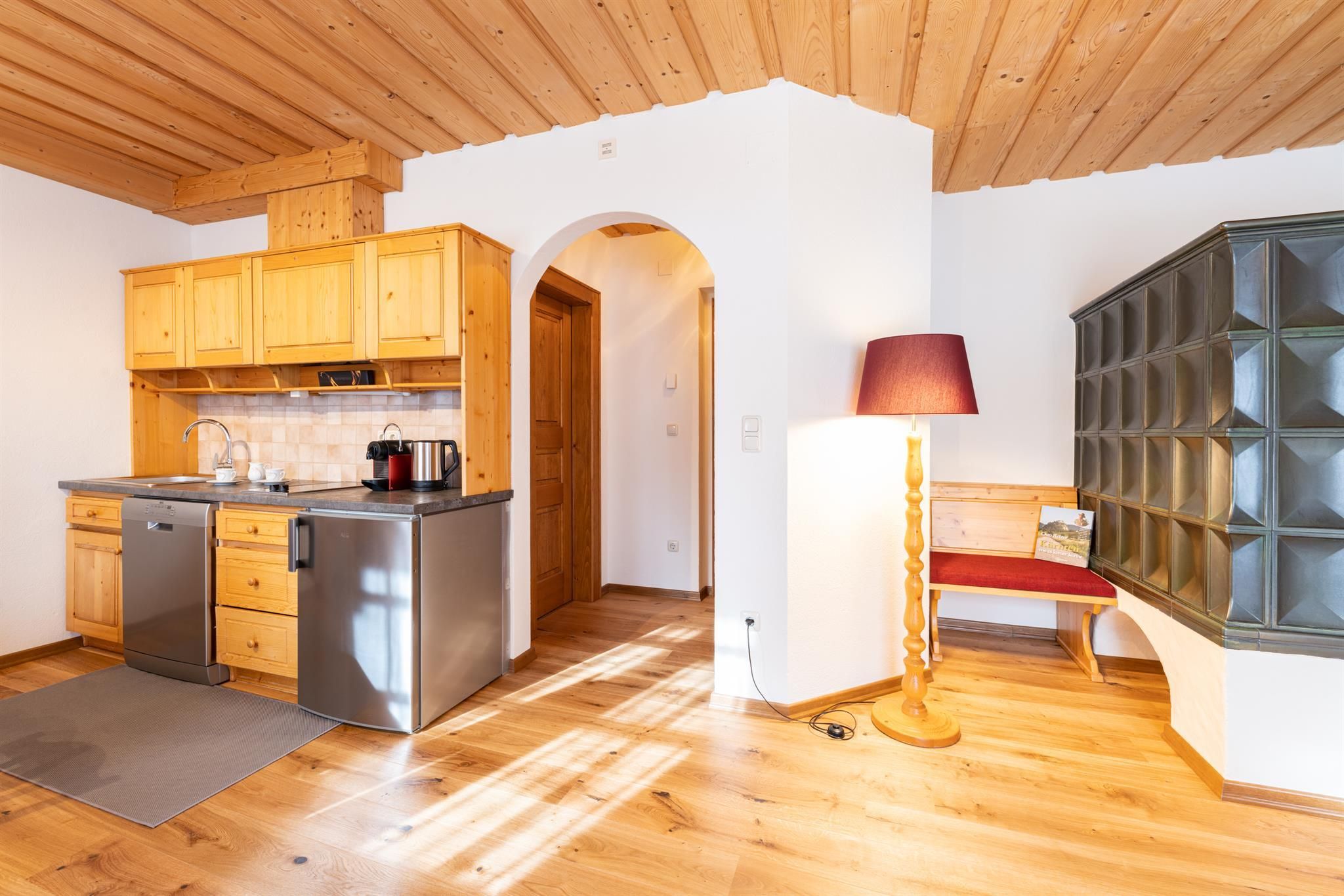 Appartement Süd Auf 50 m2 ist eine Entspannungsoase entstanden, in der bis zu 3 Personen den Alltag hinter sich lassen können. Der geräumige Wohnbereich mit Kachelofen ladet nicht nur zum Ausruhen ein, sondern bietet auch alles, um es sich gemütlich zu machen. Wenn Sie keine Lust haben auswärts zu essen, können Sie in der gut ausgestatteten Küche auch selbst kochen. Dazu gehört ein 2 Platten Ceranfeld, Geschirr, Geschirrspüler, Spüle, Nespresso Kaffeemaschine, Wasserkocher du natürlich auch ein Kühlschrank. Im Essbereich des Wohnzimmers kann dann gemütlich gegessen werden. Die Couch beim Kachelofen lässt sich bequem zu einem dritten Bett umfunktionieren. Um sich richtig durchwärmen zu lassen gibt es eine kleine Bank direkt am Kachelofen.