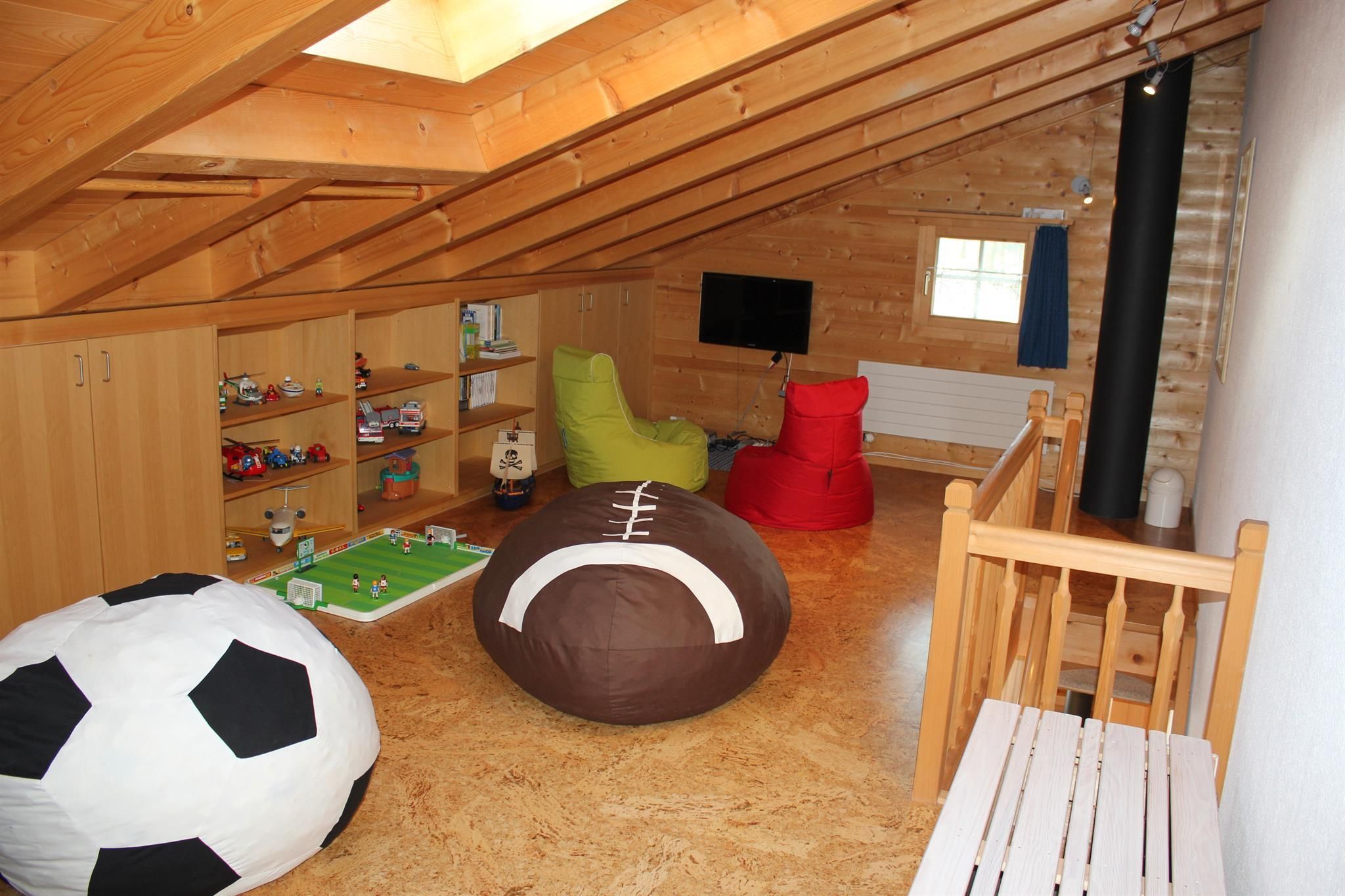 Das Spielzimmer verfügt über einen TV, zwei Spielkonsolen, Playmobil, Lego, Brettspiele und Bücher.
