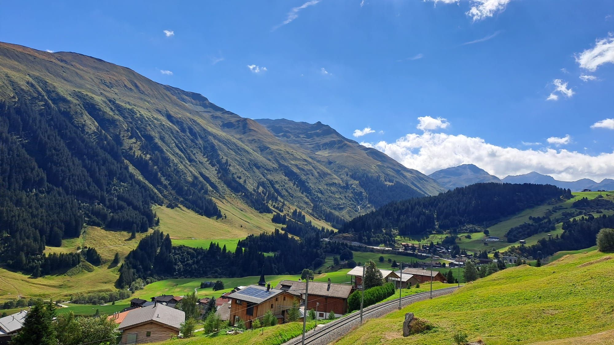 Vom Balkon aus hat man eine wunderschöne Panorama-Aussicht auf die Berge der oberen Surselva.
