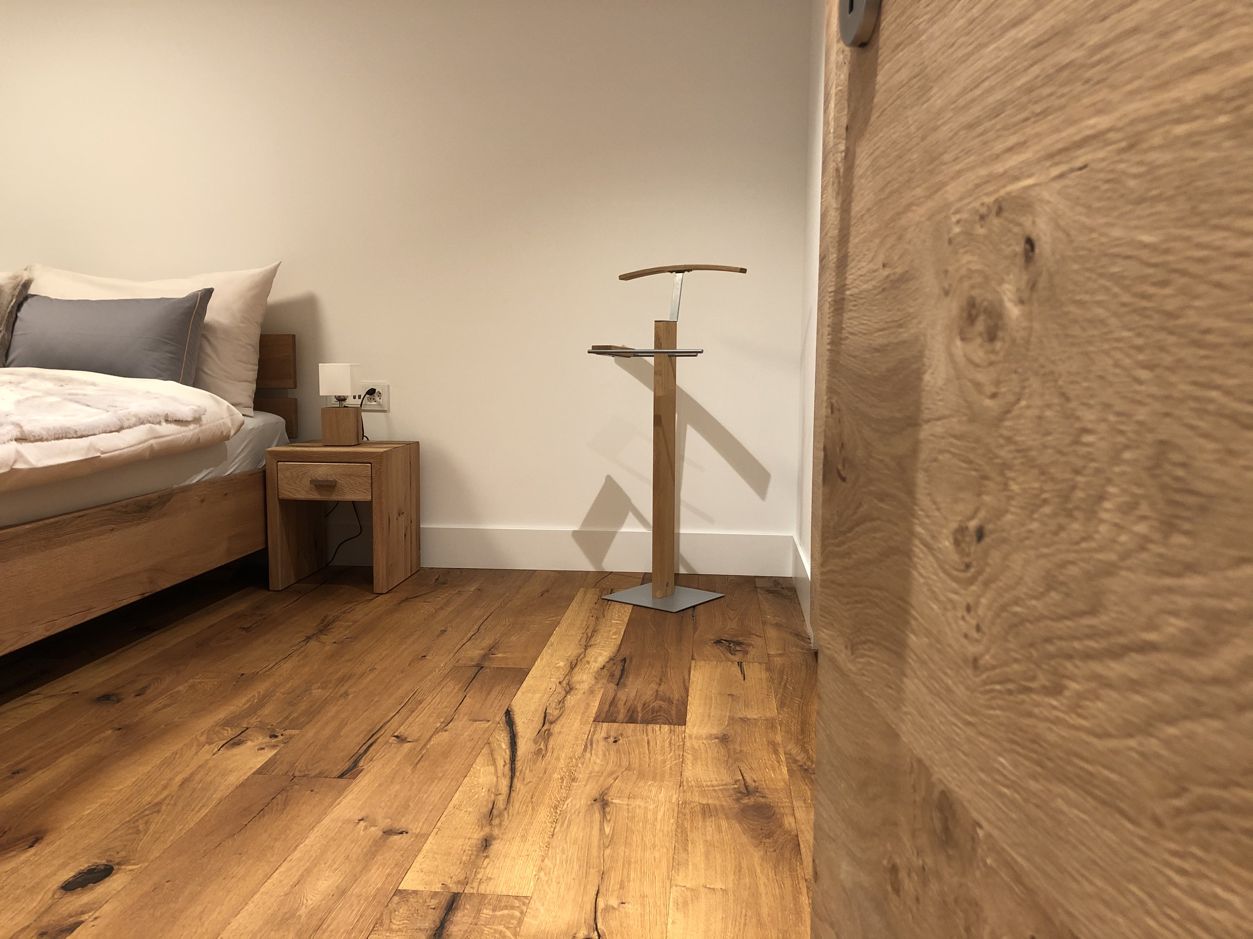 Bodenbeläge: Wohn- und Schlafräume: Holz / Badezimmer: Fliesen