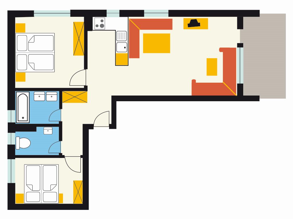 65m2, Wohnzimmer mit Ecksofa und Couchtisch, Sitzecke mit Esstisch, zwei separate Doppelschlafzimmer, Küchenabteil mit 4-Plattenherd, Backofen, Kühlschrank mit Gefrierfach, Geschirrspüler, Sat-TV/Radio, Internet, SüdbalkonBadezimmer mit Dusche, separates WC, Haartrockner