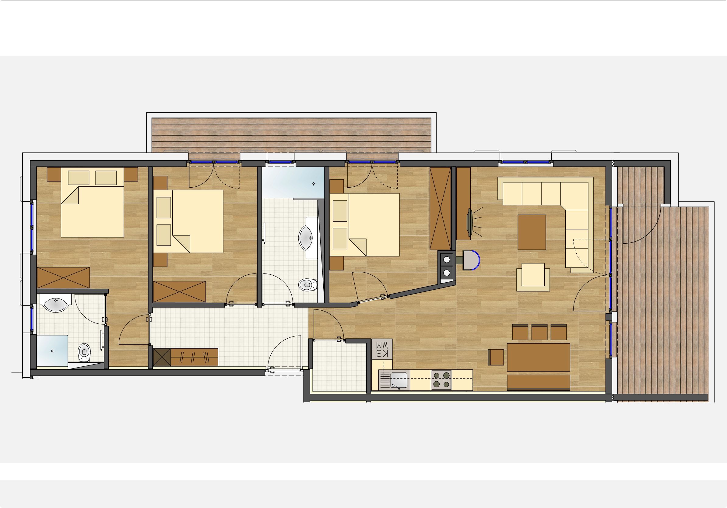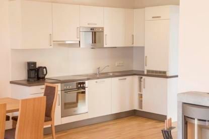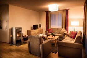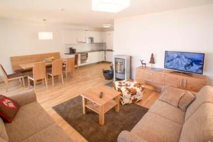 Nichtraucher Apartment im 1. Stock mit 3 Schlafzimmern, 2 Bäder mit Dusche und WC. Gut ausgerüstete Küche und Wohnzimmer mit 2 Sofas, 2 Hockern und einem Kaminofen. Das Apartment hat 2 Balkone mit den dazugehörigen Balkonmöbeln.