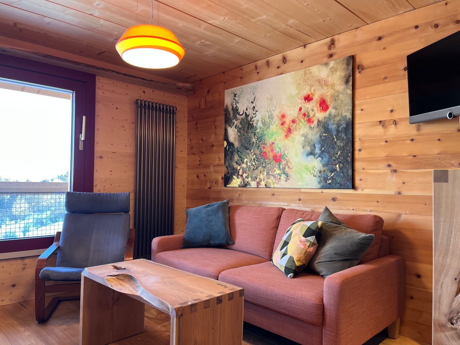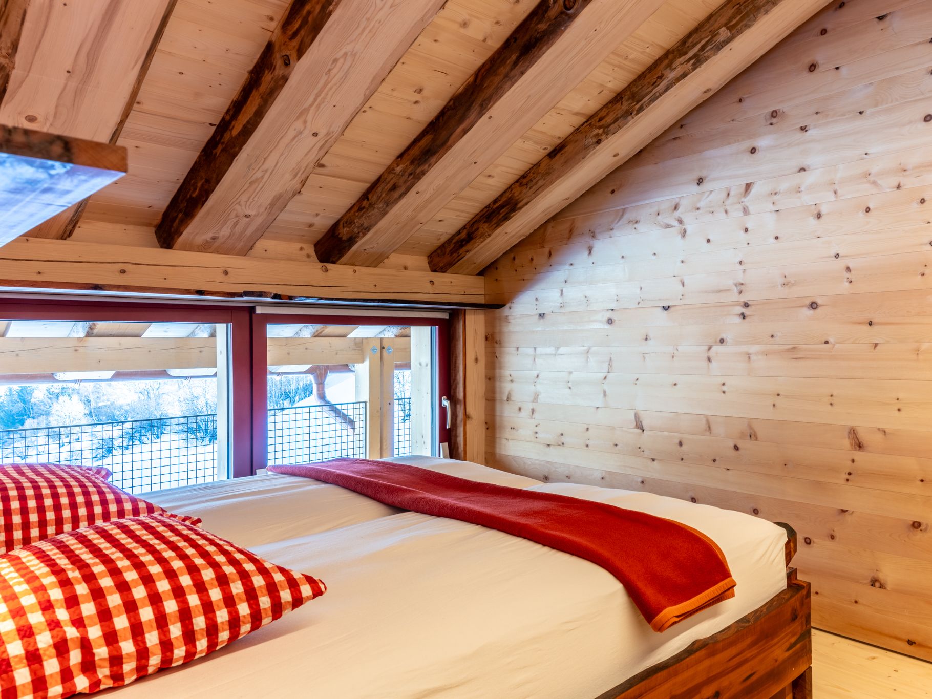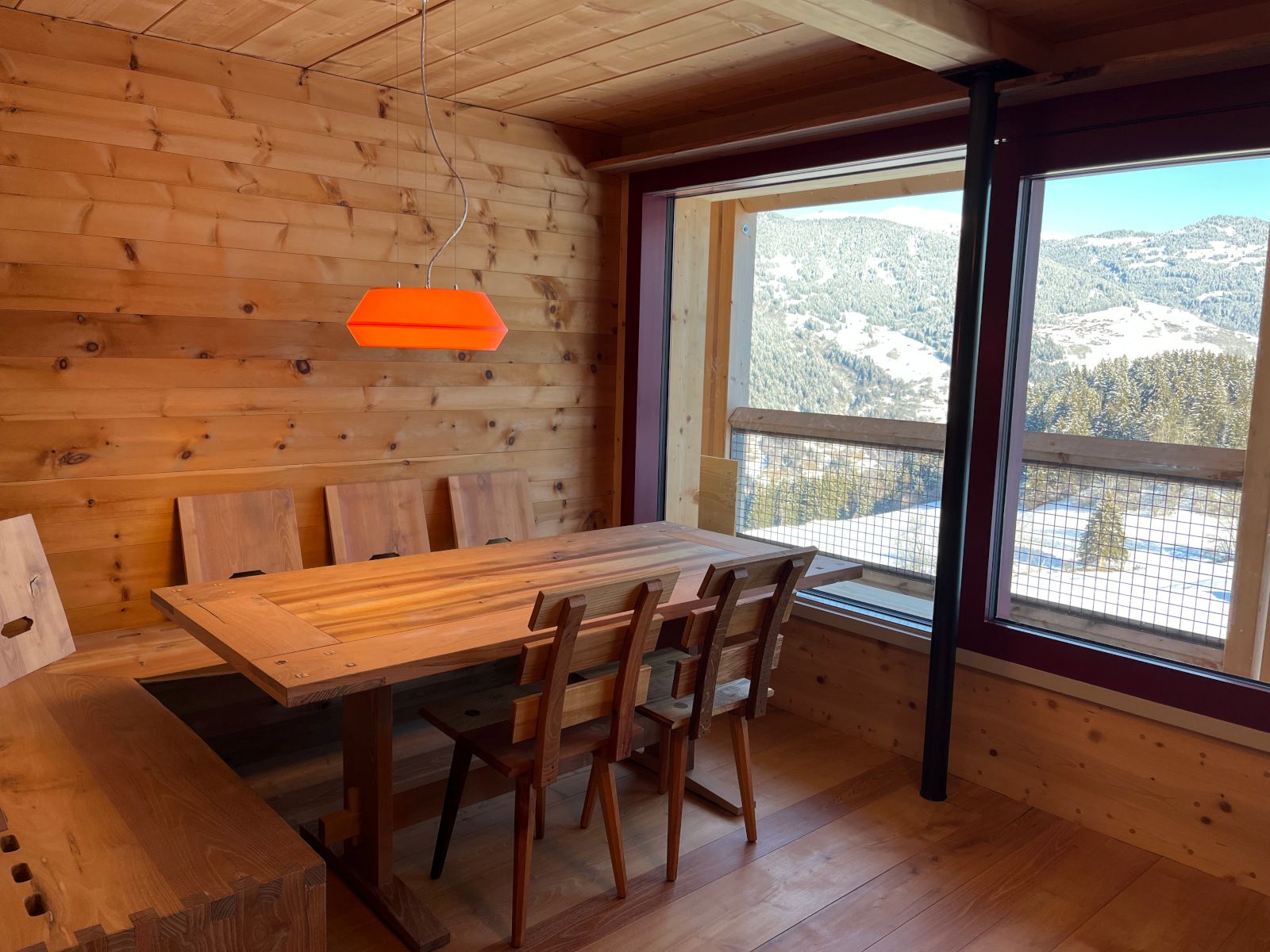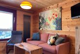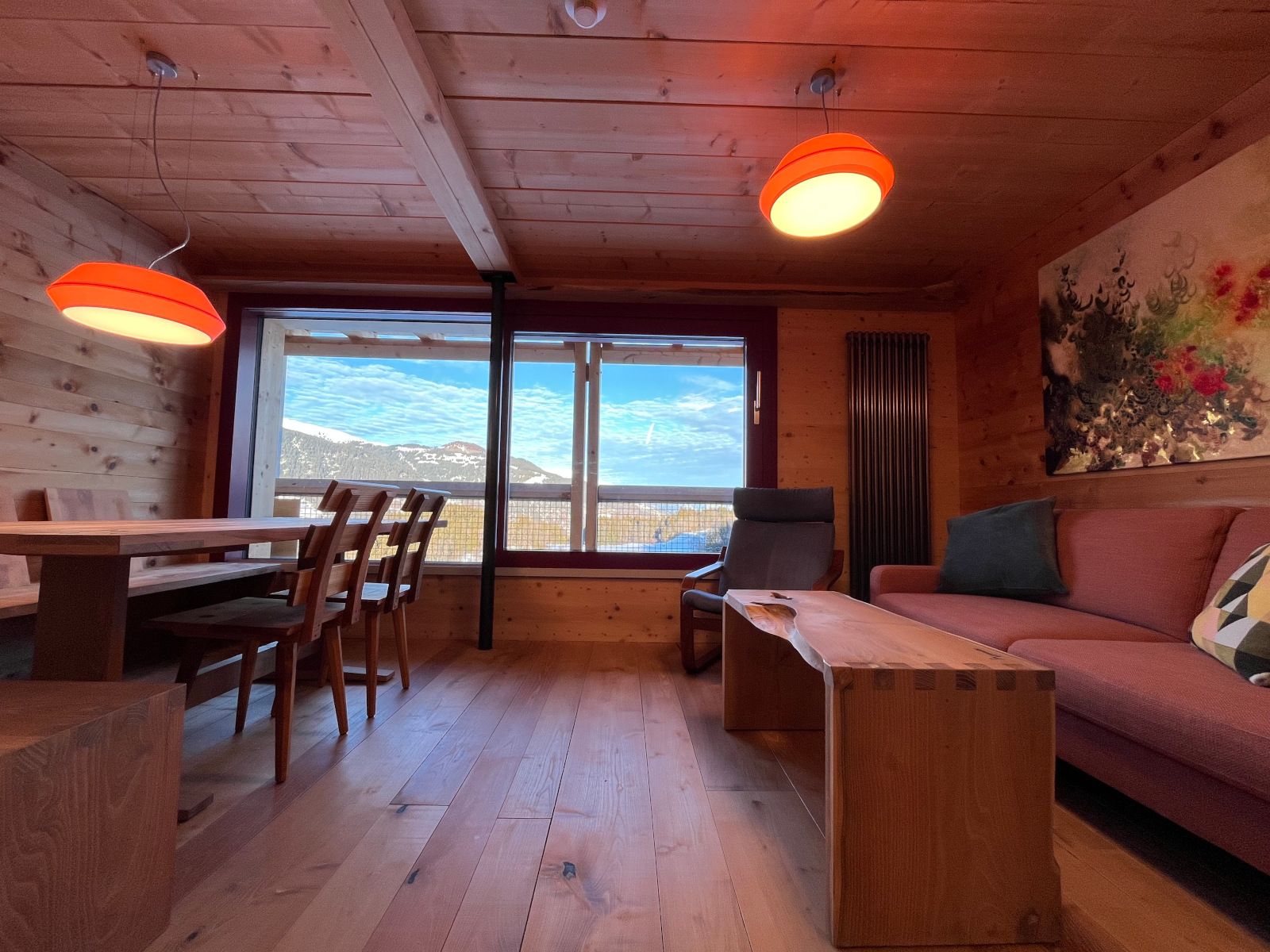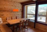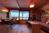 Das grosse Wohnzimmer mit Küche, Esstisch sowie gemütlicher Sitzecke mit Sofa befindet sich im Erdgeschoss. Dank den grossen Schiebefenstern geniessen Sie eine grandiose Aussicht. Flatscreen-TV und WLAN stehen zur Verfügung.
