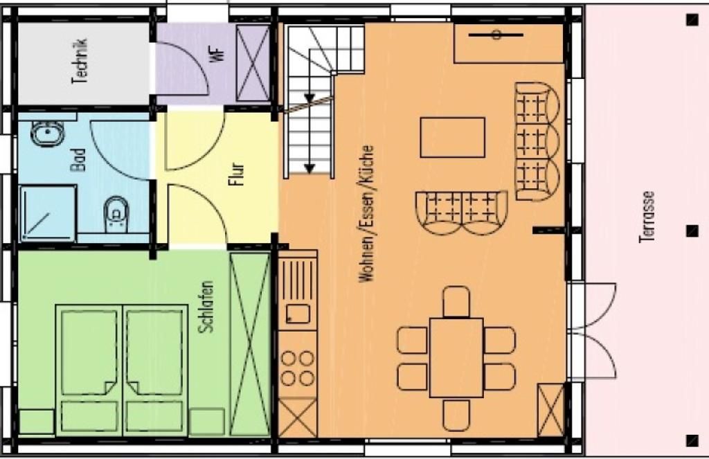 Erholen, Entspannen und Abschalten vom Alltag, das können Sie in unseren WOHLFÜHL Chalets. Im EG befinden sich 1 Schlafzimmer mit Doppelbett, großer sehr gemütlicher Wohnbereich mit Küche, Essecke, Wohnteil, Bad mit Dusche/WC und eine Terrasse. Im 1. OG befindet sich ebenfalls ein großer gemütlicher Wohnbereich mit Balkon, 1 Schlafzimmer mit Doppelbett und Einzelbett, separates WC.