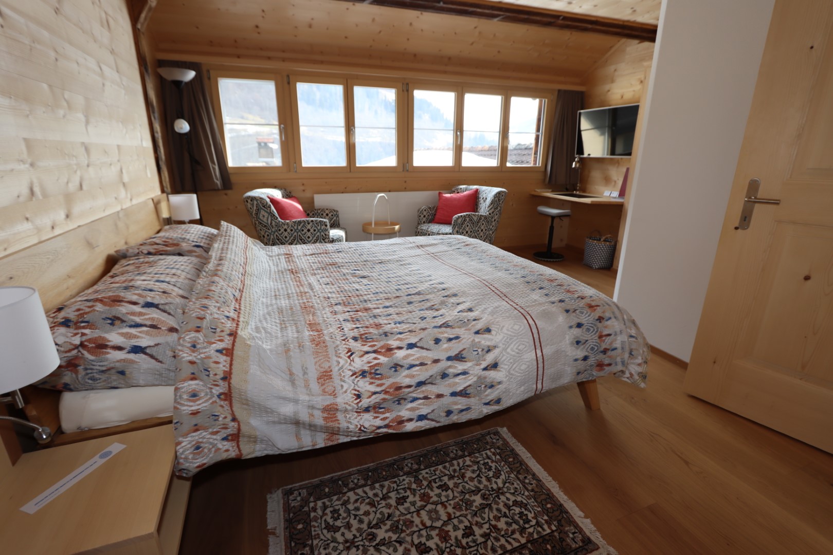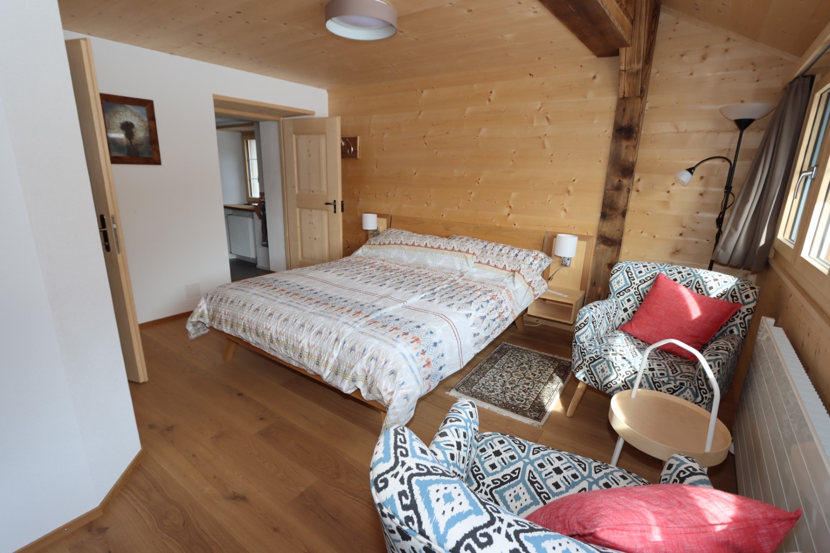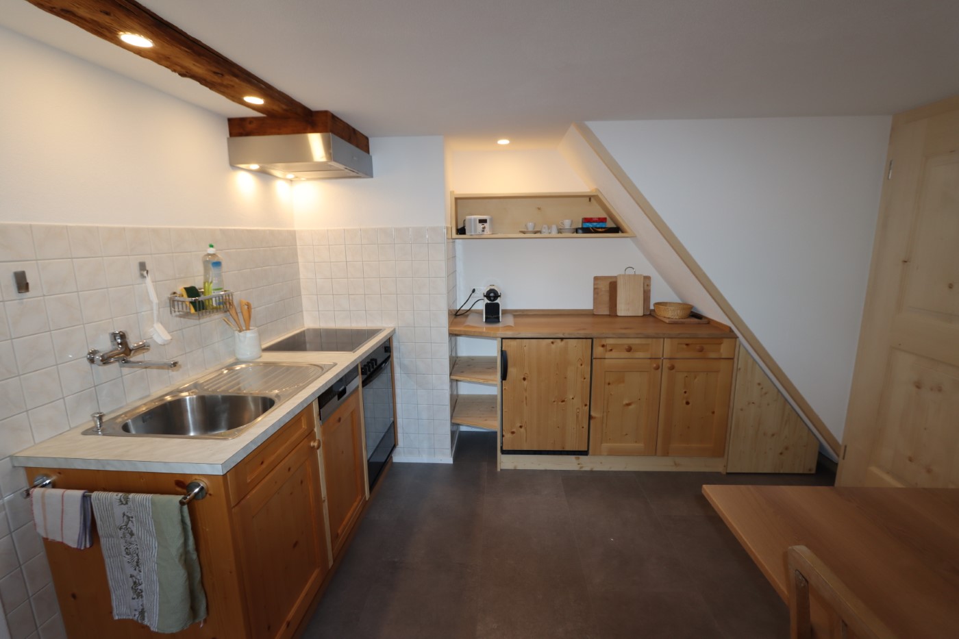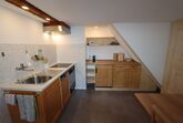 Die Ferienwohnung befindet sich im 1. OG und ist über eine Treppe (kein Lift) erreichbar. Sie wurde 2020/2021 mit viel Holz renoviert und bietet hohen zeitgemässen Komfort: Wohn-/Schlafraum mit Doppelbett 160/200cm, Kleiderschrank aus Fichtenholz, Sitz- und Schreibecke, WLAN, Satelliten-TV. Nasszelle mit Dusche/Lavabo/WC. Separate, gut ausgestattete Wohnküche mit 4-Plattenherd, Backofen, Dampfabzug, Kühlschrank Abwaschmaschine und Nespresso-Kapselmaschine.