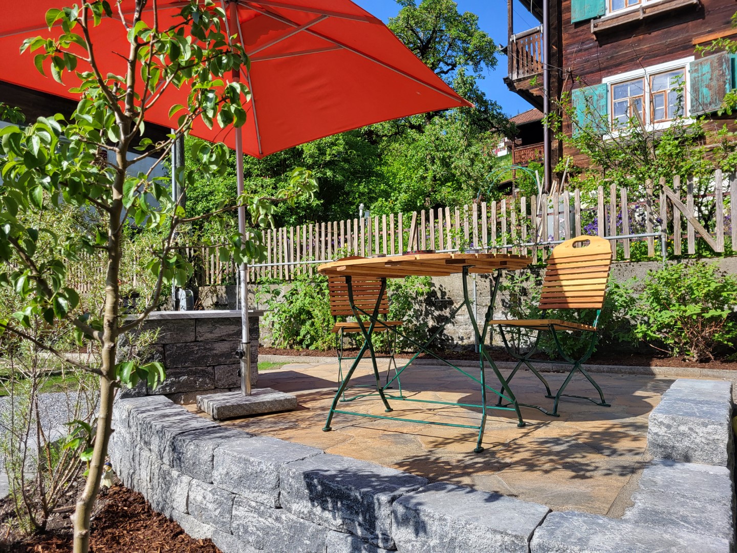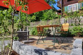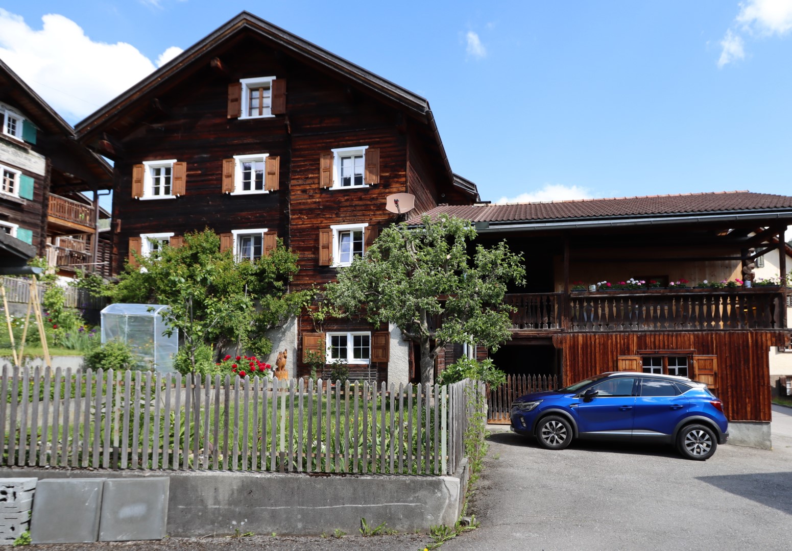 In der warmen Jahreszeit steht unseren Gästen ein Sitzplatz im Garten zur Verfügung. Im Winter ist Platz für die Winterausrüstung in beheiztem Raum. Hunde sind willkommen. Gästeparkplatz vor dem Haus.