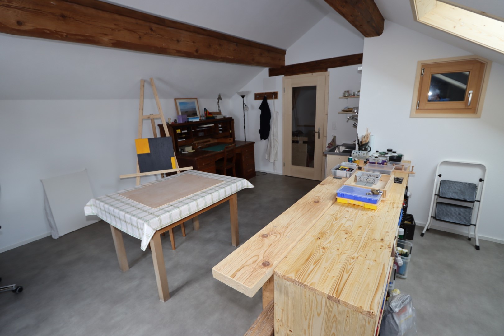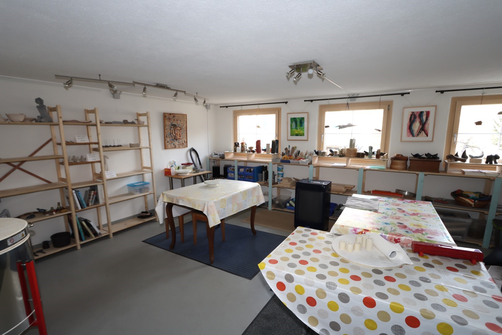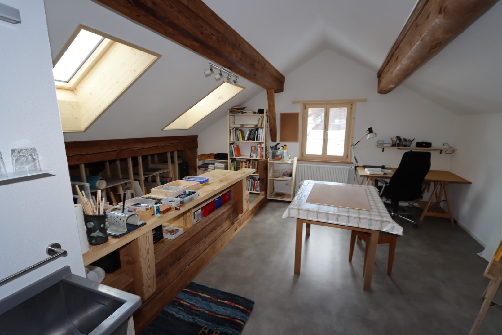 Im Haus steht ein grosses, beheiztes Malatelier/Arbeitsraum mit mehreren Arbeitsflächen/-plätzen zur Mitnutzung zur Verfügung. Im Nebengebäude befindet sich ein Keramikatelier mit 2 Arbeitsplätzen (verfügbar von März bis Oktober). Hier können sie ihre kreativen Seiten ausleben, sei es beim Malen, Zeichnen, Töpfern, Schreiben oder musizieren.