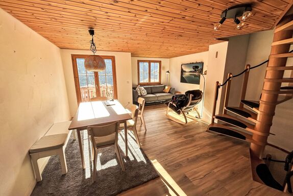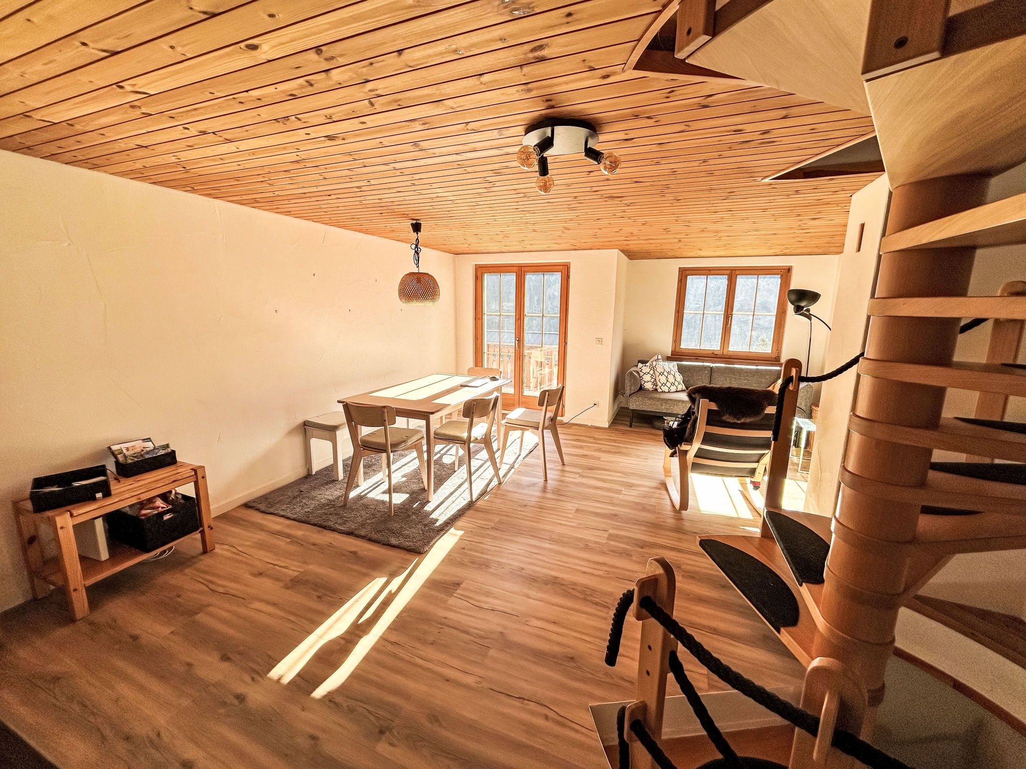4-Zimmer-Wohnung 95 m2 auf 3 Stockwerken. Renoviert im Jahre 2025, komfortabel und gemütlich eingerichtet: Wohn-/Esszimmer. Ausgang zum Balkon. Offene Küche (Backofen, Geschirrspüler, 4 Glaskeramikplatten, Toaster, Wasserkocher, Tiefkühler, elektrische Kaffeemaschine, Racletteofen, Fondue Set (Käse)). Unteres Geschoss: 1 Zimmer mit 1 Bett. Dusche/WC. Obergeschoss: (Wendeltreppe) 1 Doppelzimmer. 1 Zimmer mit 3 Betten. Bad/WC. Balkon 20 m2, Südlage. Balkonmöbel. Sehr schöne Sicht auf die Berge, das Tal, die Landschaft und die Ortschaft. Zur Verfügung: Waschmaschine. Internet (WLAN, gratis). Parkplatz (2 Autos) beim Haus. Bitte beachten: Nichtraucher-Unterkunft.