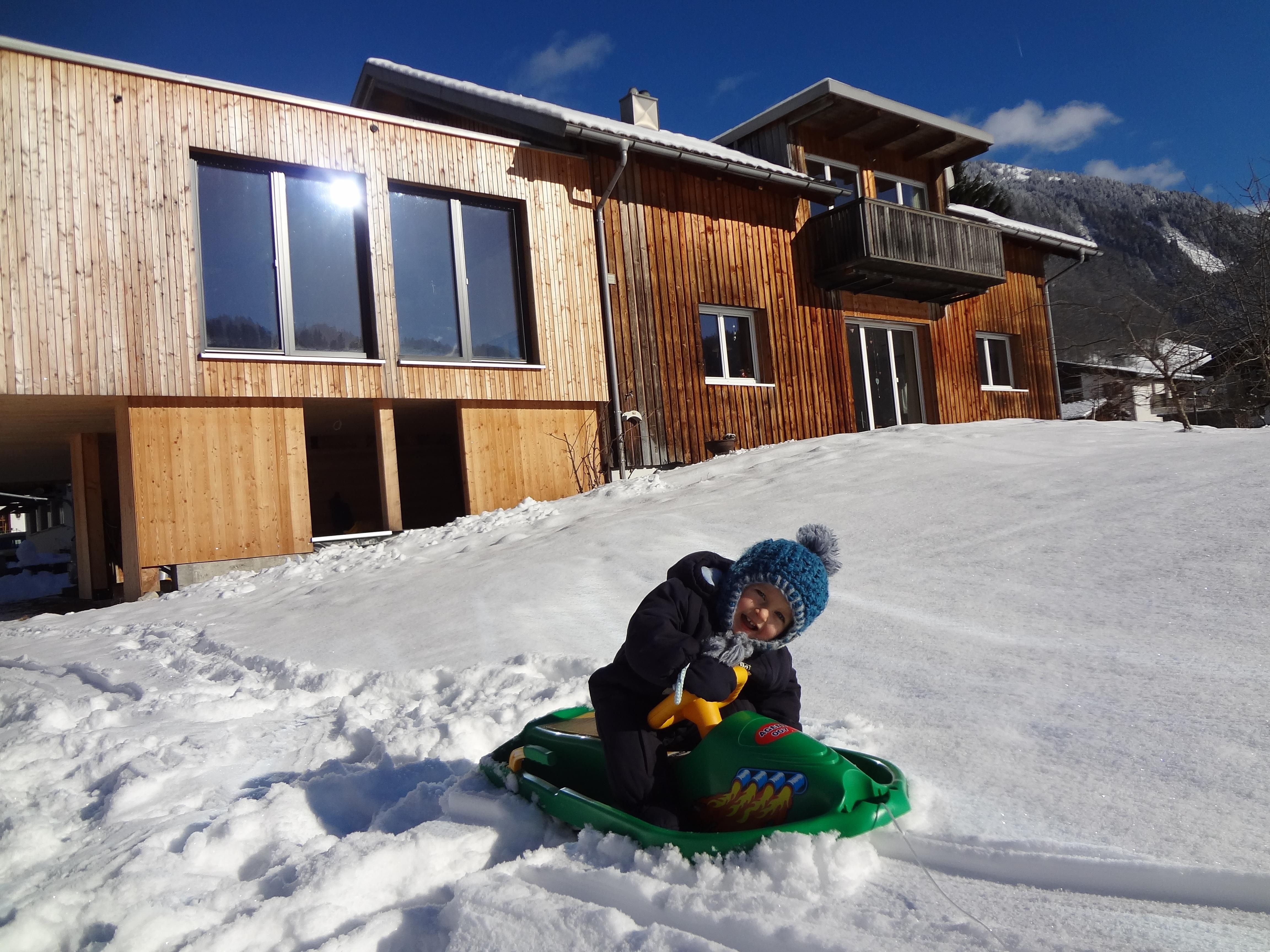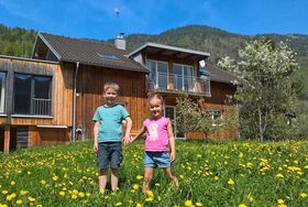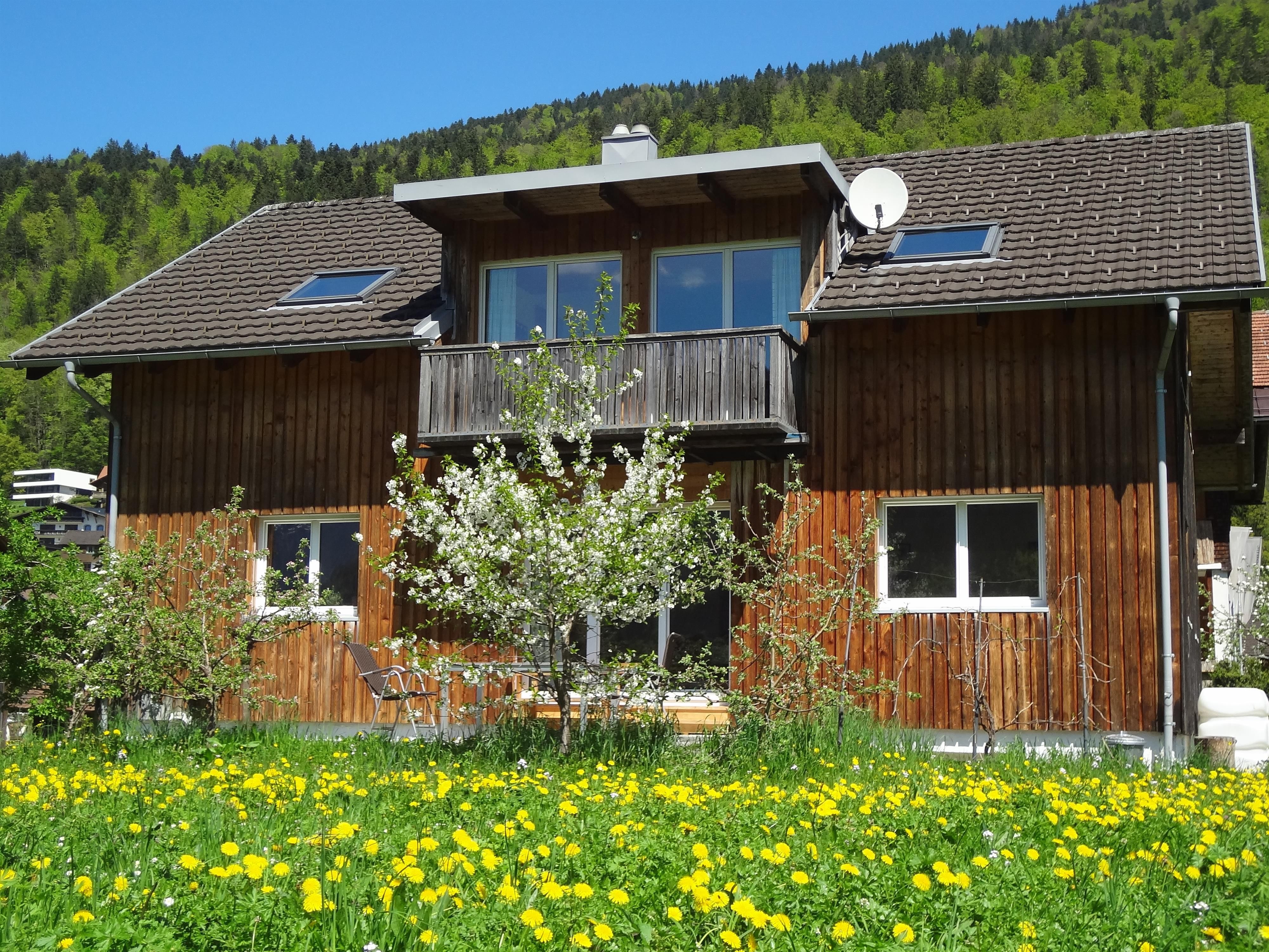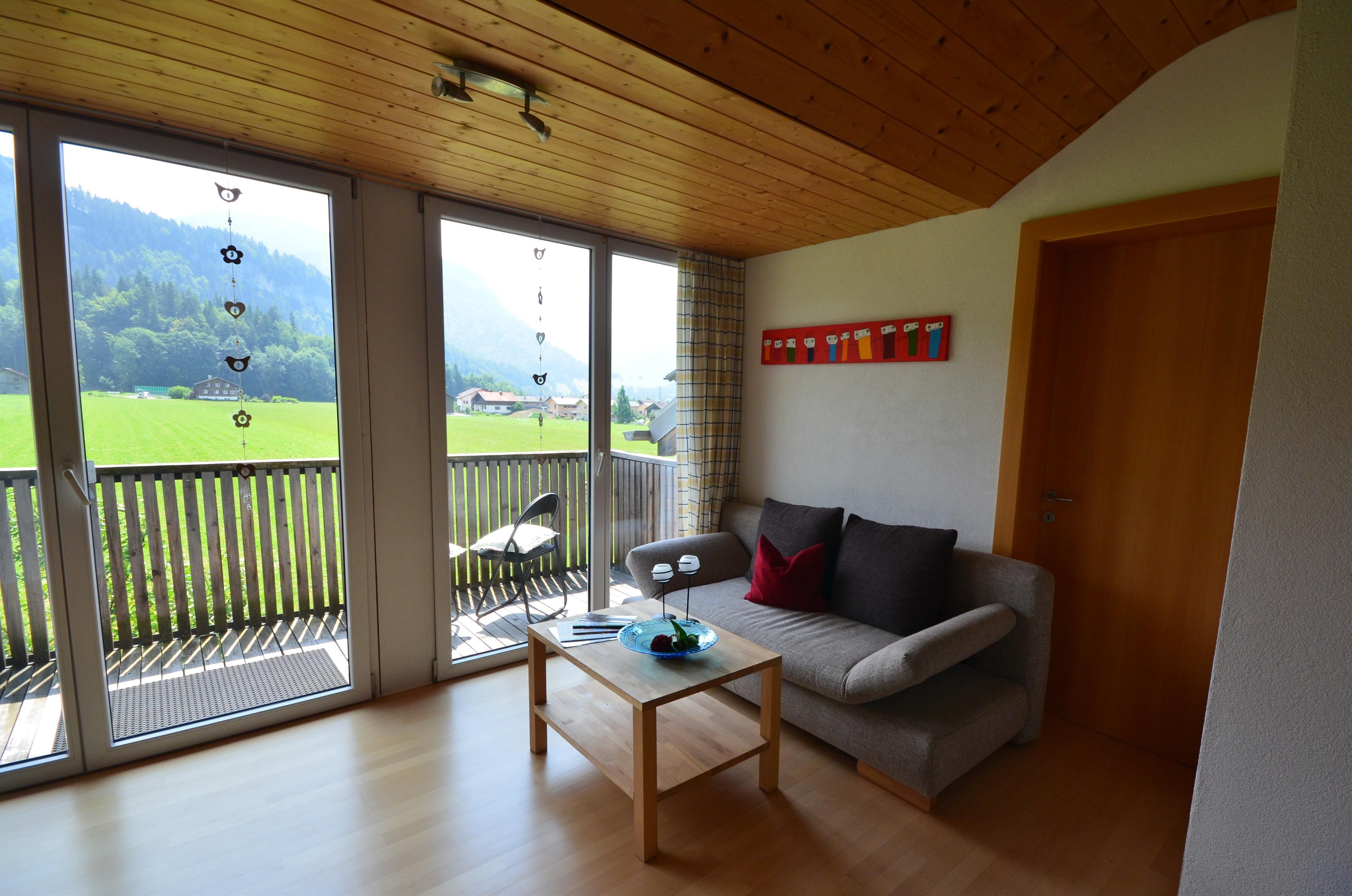 Unsere gemütliche, ruhige Wohnung (eigene Etage mit eigenem Eingang - ca. 100 m²) besteht aus 3 schönen Schlafzimmern, einer großen Wohnküche mit Geschirrspülmaschine, einem großen Bad mit Dusche, Badewanne sowie WC, einem separaten WC und einem Südbalkon mit toller Aussicht mit Bergblick nach Mellau und Damüls.