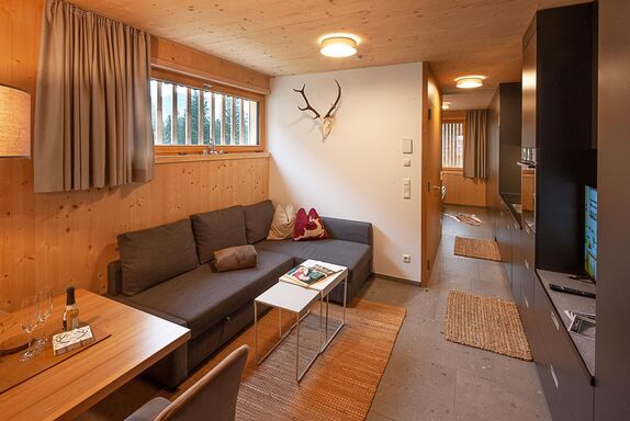 Der Wohnbereich mit Schlafsofa, TV und Essplatz ist zur Bergseite ausgerichtet – mit gemütlicher Fensterbank als Lieblingsplatz. Die Küche ist modern, der Schlafbereich flexibel (Doppel- oder Einzelbetten). Abends lädt der überdachte Außenbereich zum Entspannen ein – perfekt für einen Drink in der Abendsonne.