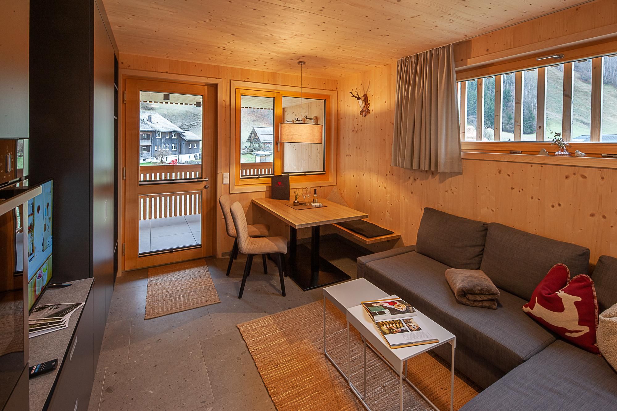 Wohnbereich mit Schlafsofa, TV und Essplatz mit Bergblick. Die Küche ist modern, der Schlafbereich flexibel (Doppel- oder Einzelbetten). Abends lädt der überdachte Außenbereich zum Entspannen ein – perfekt für einen Drink in der Abendsonne. Jetzt buchen und die Kraft der Berge spüren!